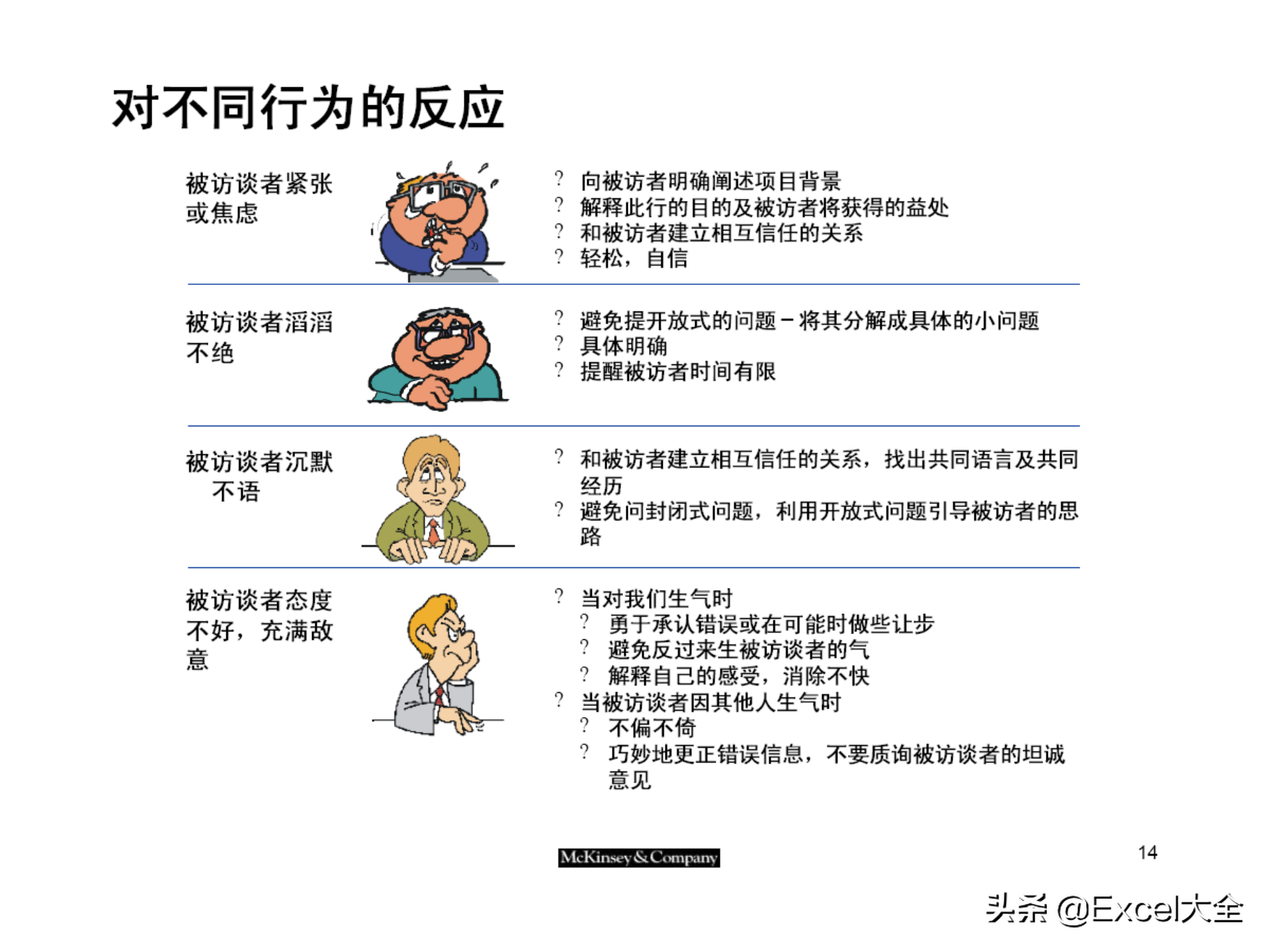 针对不同行为,做出针对性的反应,确保访谈顺利进行:如,消除被访谈者的紧张和焦虑情绪、避免被访谈者的滔滔不绝或者沉默不语、恰当应对敌对态度;