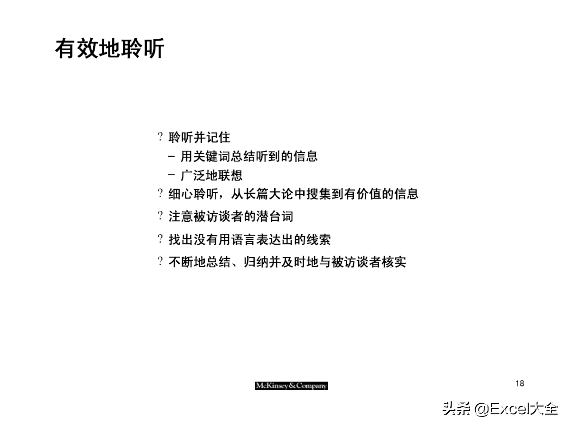 有效聆听,总结归纳对方观点,并及时核实:如,聆听并记录关键词、及时捕捉有价值的信息、注意对方语言中的潜台词、找出没有表达出来的线索、及时确认等方法。