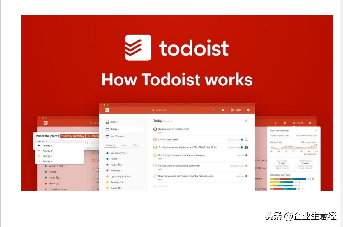 9、 Todoist 是一个很好用的代办事项软件。可以用它来添加任务和代办事项。默认会显示当前一周七 天,可以在每天中直接添加任务,设置提醒日期,还可以添加标签优先级。有了 Todoist,做事情再也不要各种扑火了 ,让你成为一个井然有序的人。 还可以将任务添加到不同的项目分类中, 分类中还可以、加板块(文件夹),一键折叠还可以查看不同的板块。它简洁的风格,实用的功能,真的让工作变得井然有条