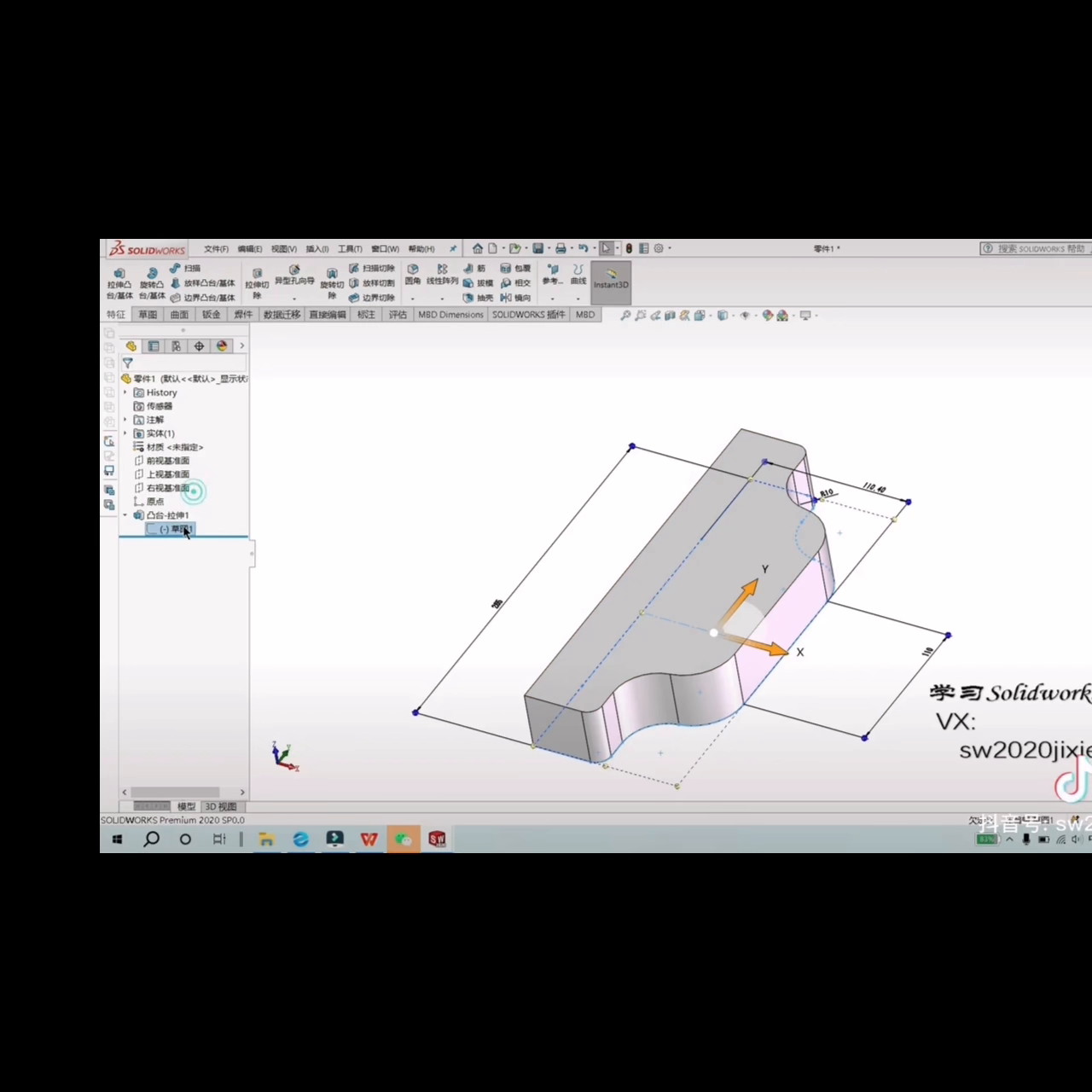 切边是怎么造成的?进草图看一下,进到当前的拉伸图台的草图里面去。当前的草图是由一段段圆弧和一段段直线组成,圆弧跟直线之间它之相切的关系,这个相切的点就是在几何里面叫的切点,这个切点在草图里面是以点的形式存在的。你在做范围模型以后就会从一个点拉伸成一条线,从而使之产生这样一条线段。