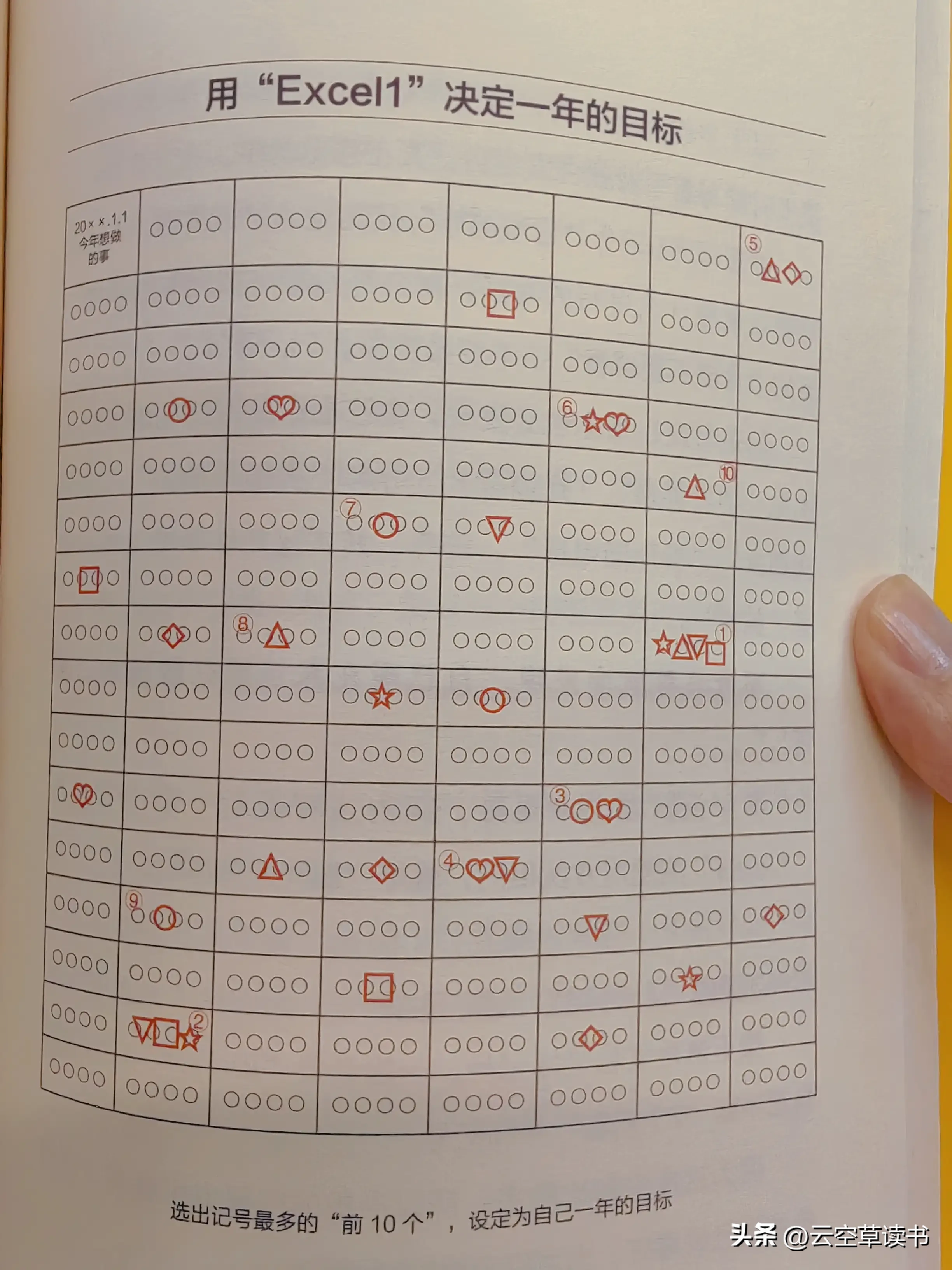 最后选出记号最多的前10项,就是今年要做的事,1个月完成1个目标。