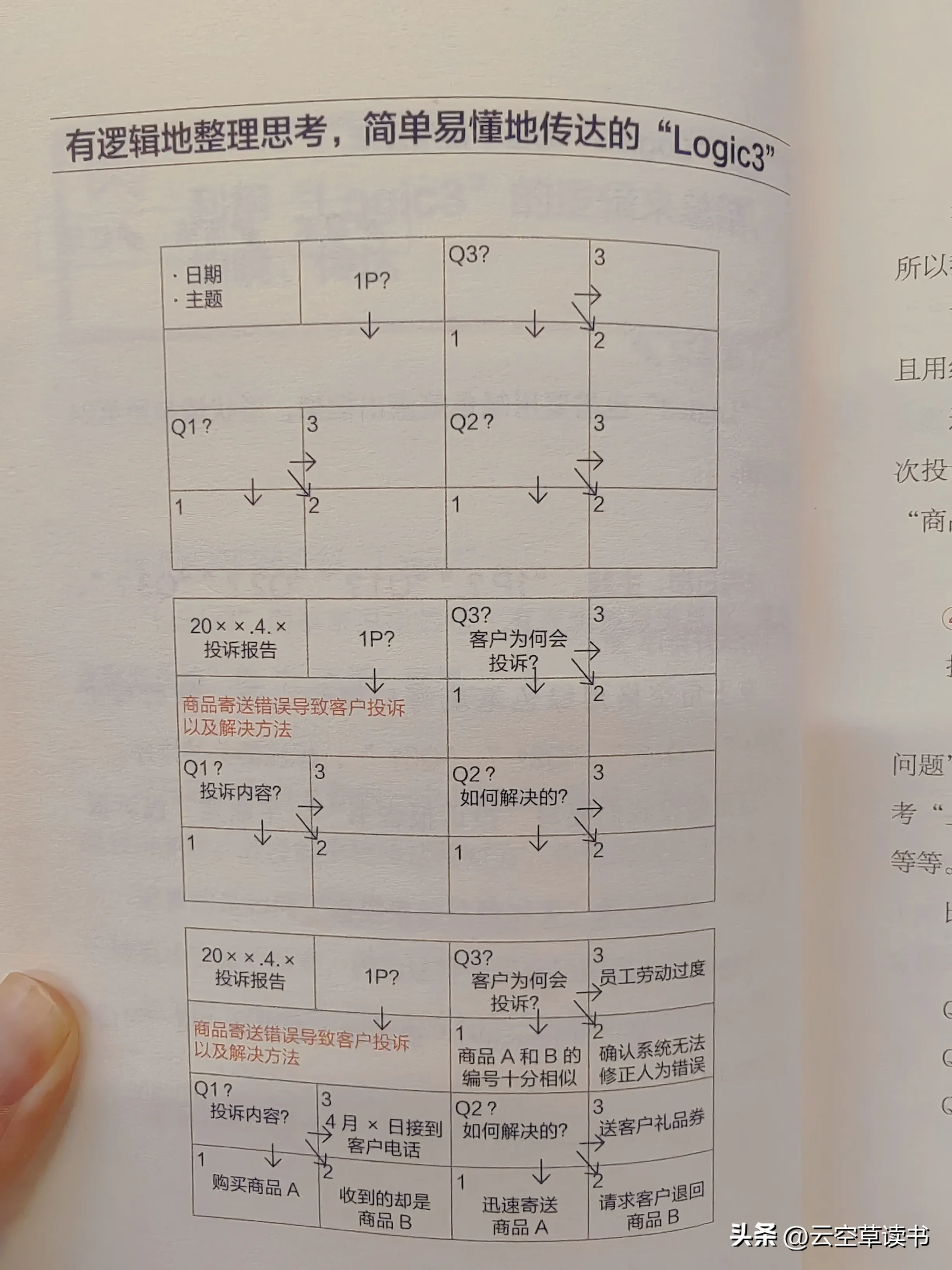 绿笔:画框架,写日期、主题,写标题1P(总结)和Q1、Q2、Q3(问题),标注箭头。