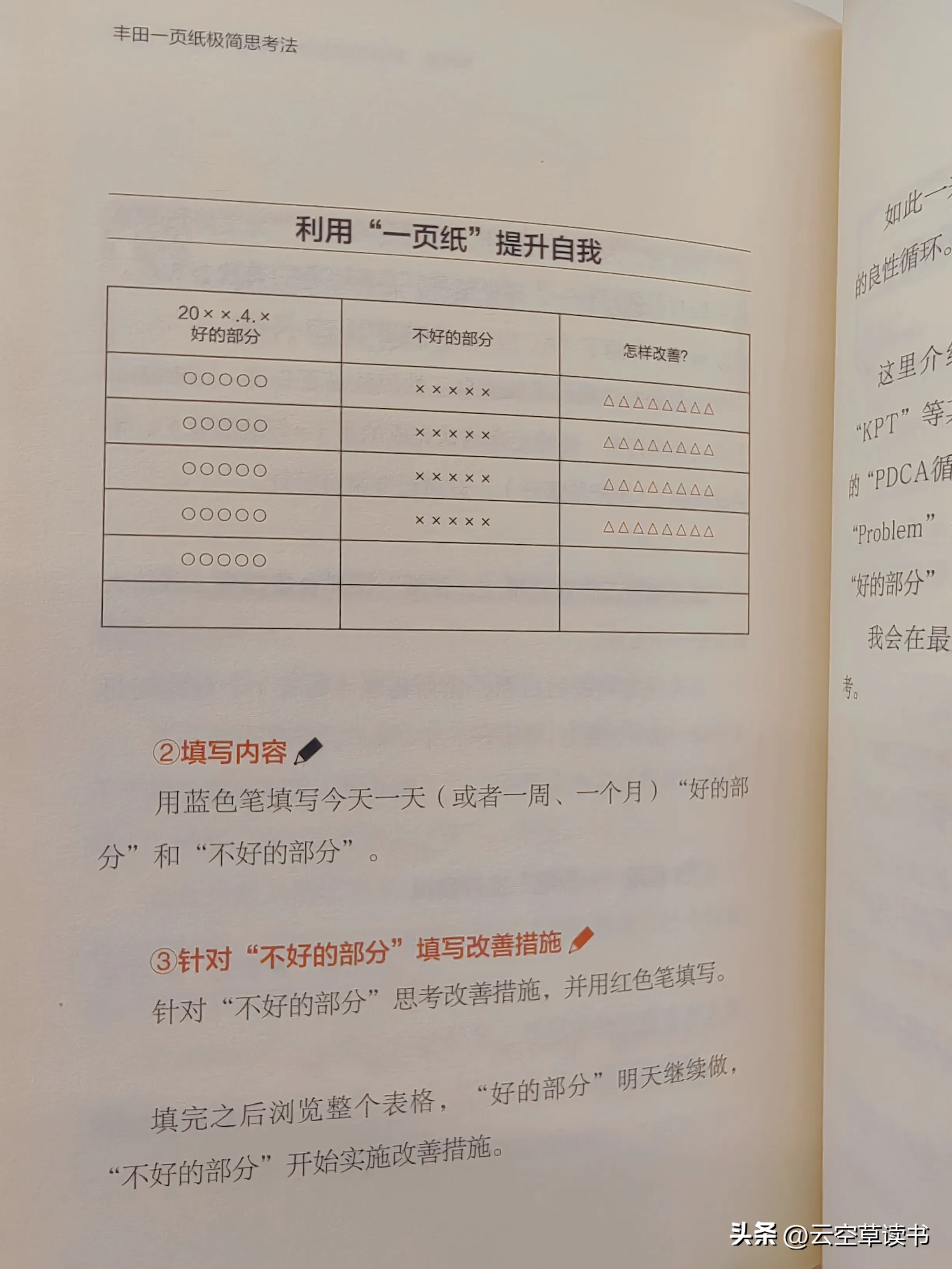 蓝笔:填写“好的部分”和“不好的部分”。