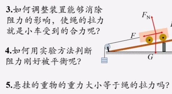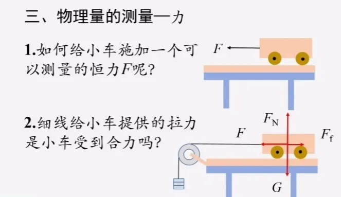 那么请同学们继续思考,这时,细线给小车的拉力,是小车所受的,合力吗。此时,我们可以