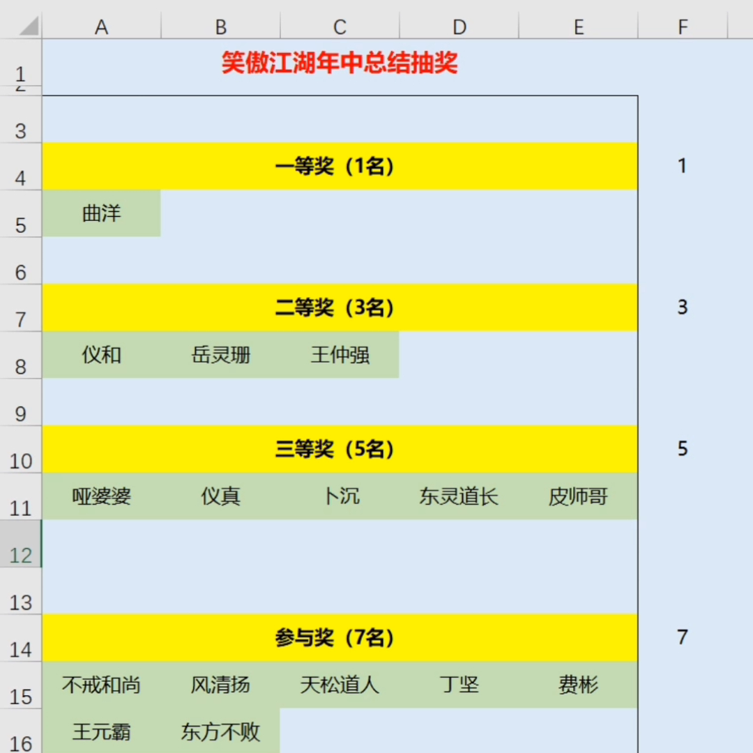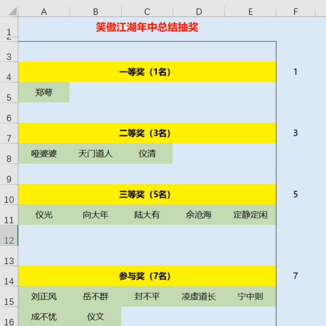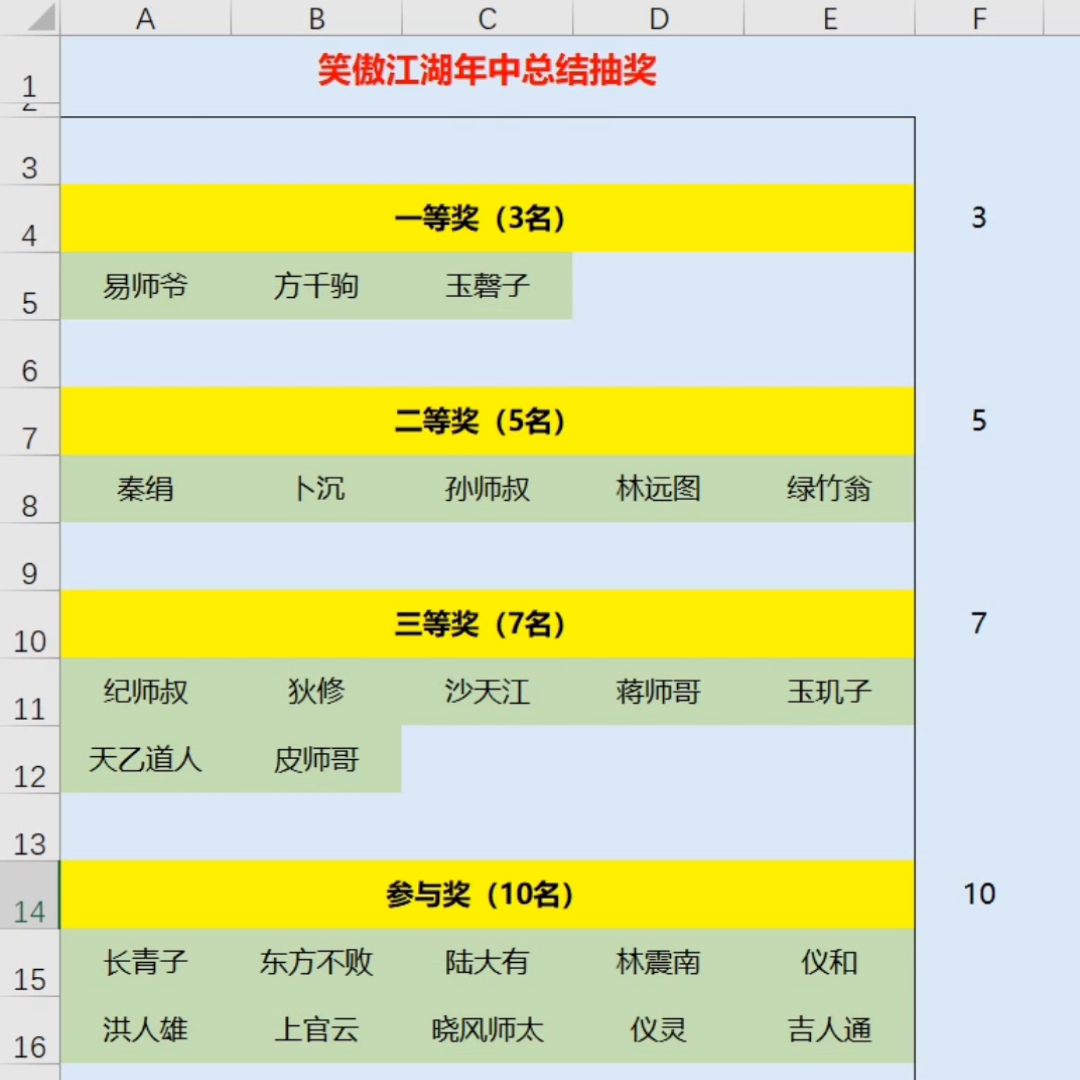 比如现在到年终,像江湖中的一些人员需要来参加年终的会议,现场需要进行现场的抽奖,这个时候怎么去设定现场随机抽奖情况?首先要设定一个名额就说每个奖项到底有几个人。比如一等奖或者一个人,二等奖设置三个人,三等奖设置五个人,参与奖设置七个人。设置好人数之后,这个时候只要先用数据上的自动计算,这个时候可以看到系统上的随机中奖的名单,都在随机的中切换。