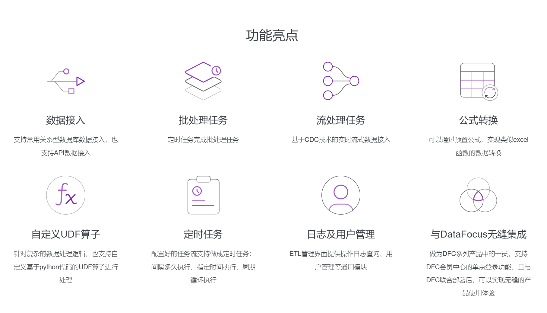 首先,DataSpring具备数据接入功能,能够快速接入常用关系型数据库和API数据。同时,DataSpring也支持定时任务完成批处理任务,基于CDC技术的实时流式数据接入,以及自定义UDF算子等高级数据转换功能,在保证数据准确性的同时也能够提高数据处理效率。