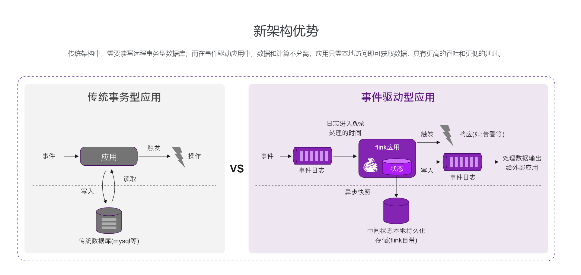 其次,DataSpring采用最新的流式架构,将数据与计算无缝结合,从而具有更高的吞吐和更低的延迟。这种架构和传统架构相比,避免了频繁地读写远程事务型数据库,可以更好的适应现代业务的实时特性。