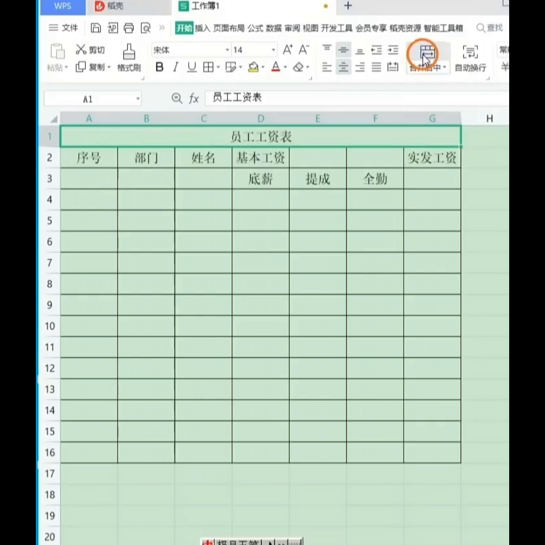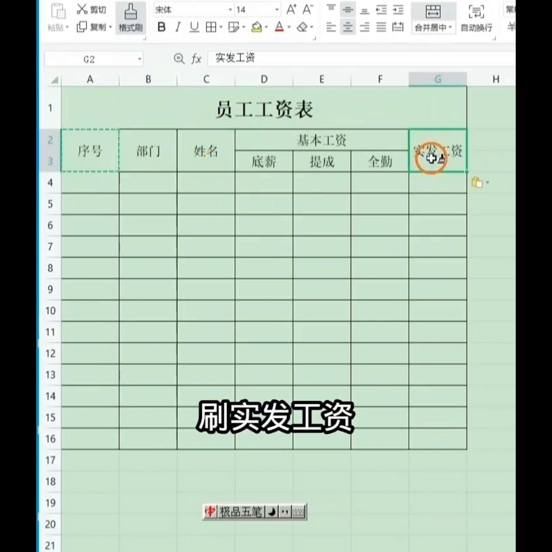 然后将鼠标放到第一行的行标线上,按住鼠标左键,不要松手向下拖动,调整一下标题行的行高。接着再选中基本工资和它右侧的两个空白单元格,点合并后居中。再选择序号和它下方的一个空白单元格,按F4键重复上一步的合并居中。双击格式刷刷部门刷姓名,刷实发工资。