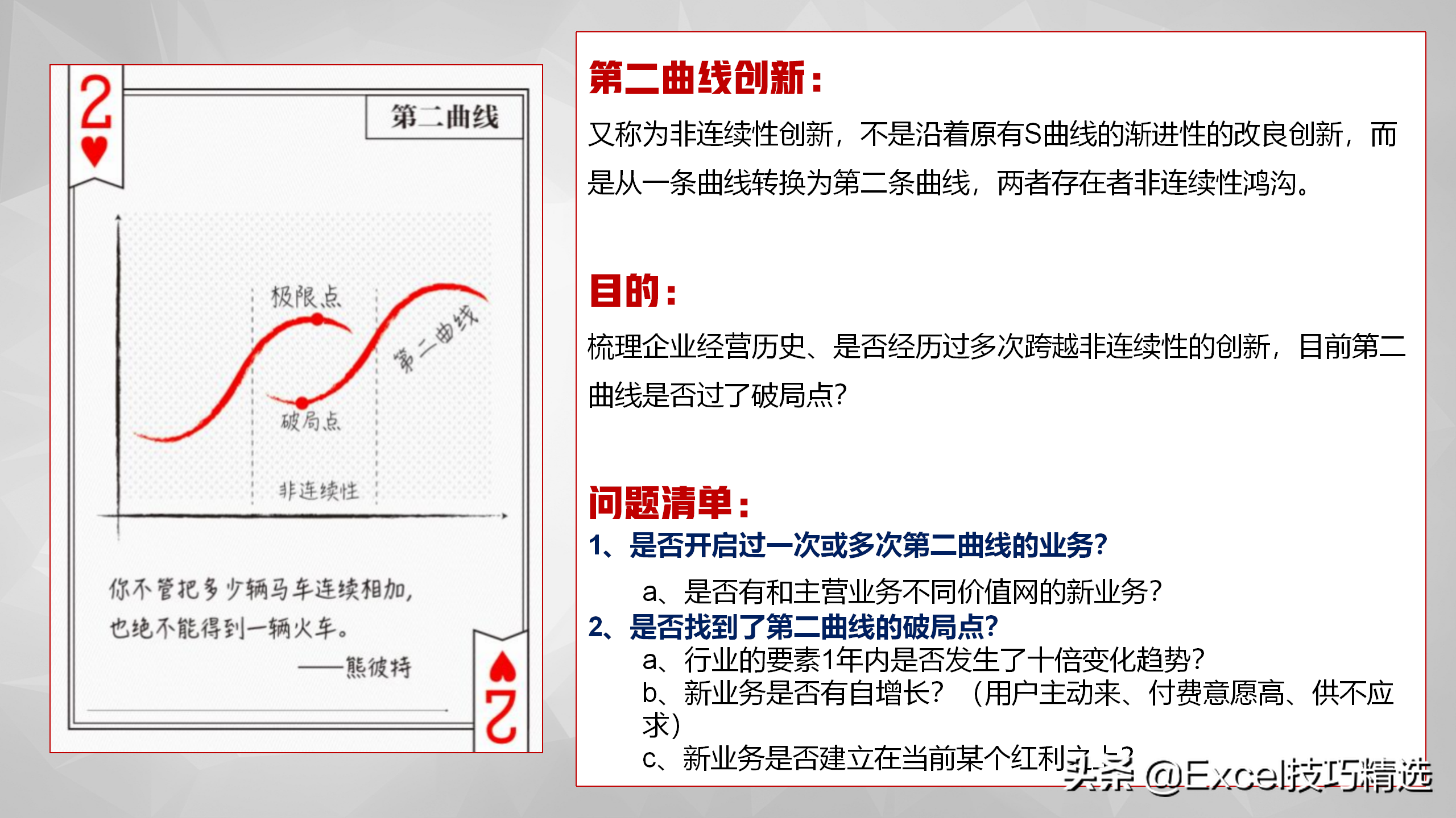 从一条曲线转换为第二条曲线,两者存在着非连续性鸿沟。可以用来梳理企业经营历史,判断是否经历过多次跨越非连续性的创新,目前第二曲线是否过了破局点?