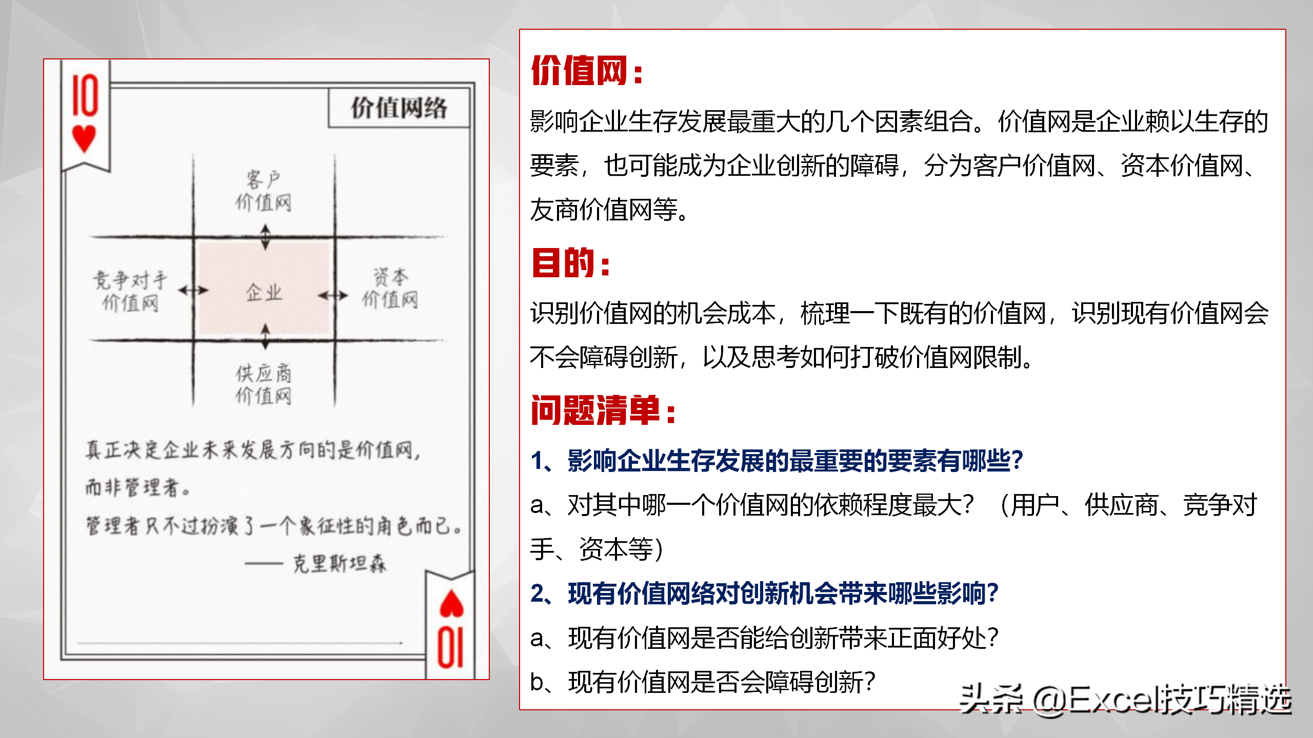 影响企业生存发展最重大的几个因素组合。用来识别价值网的机会成本,梳理一下既有的价值网,识别现有价值网会不会障碍创新,以及思考如何打破价值网限制;