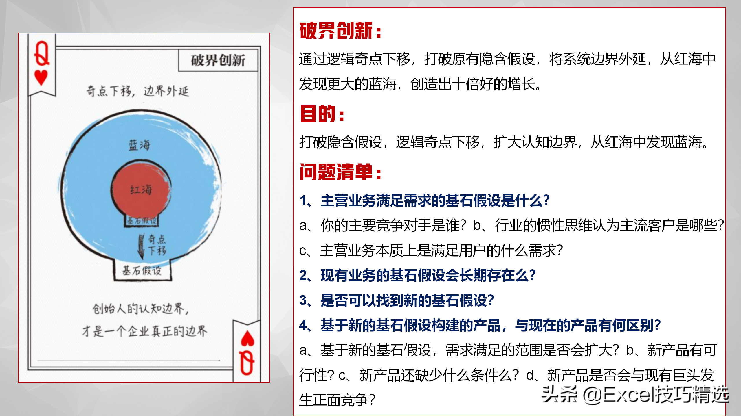 通过逻辑奇点下移,打破原有隐含假设,将系统边界外延,从红海中发现更大的蓝海,创造出十倍好的增长。