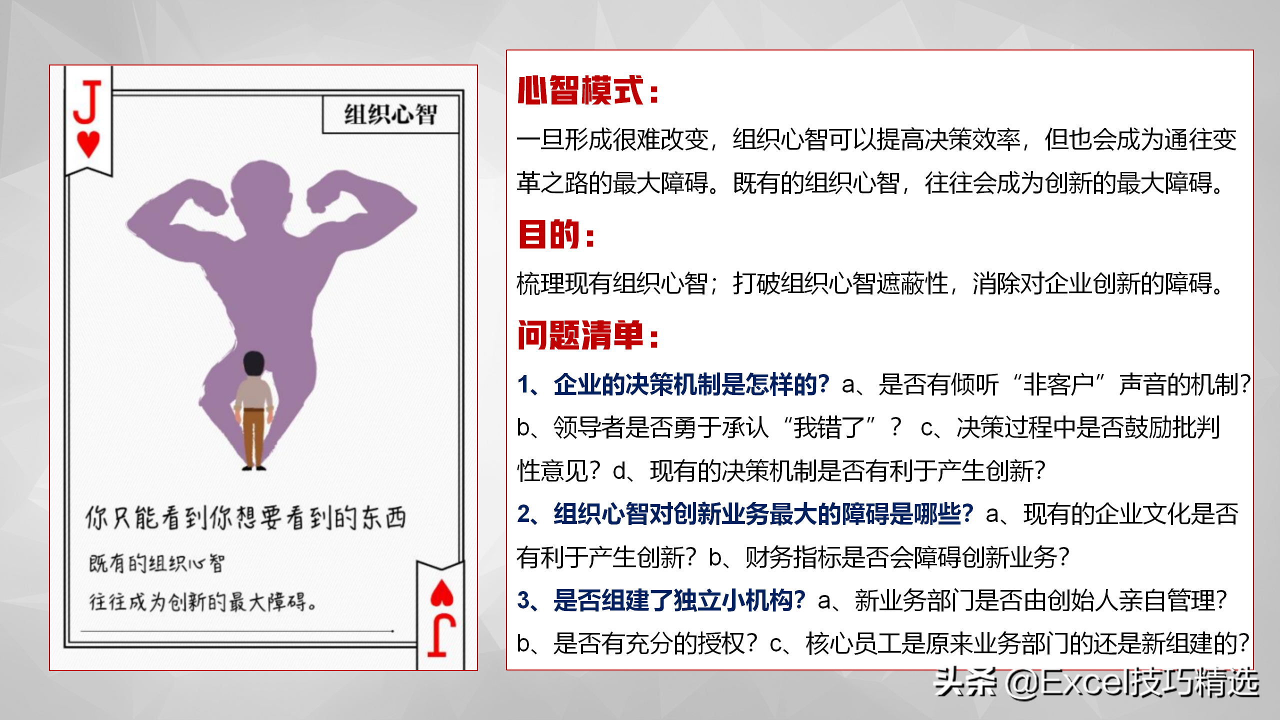 心智,一旦形成很难改变,组织心智可以提高决策效率,但也会成为通往变革之路的最大障碍。用来梳理现有组织心智;打破组织心智遮蔽性,消除对企业创新的障碍;