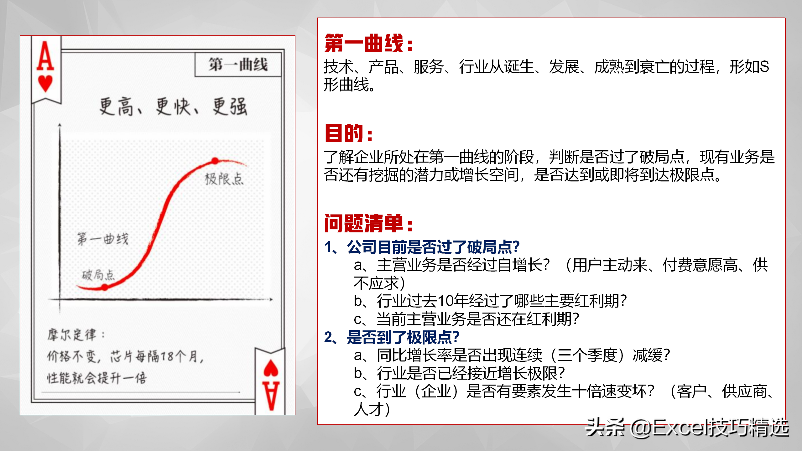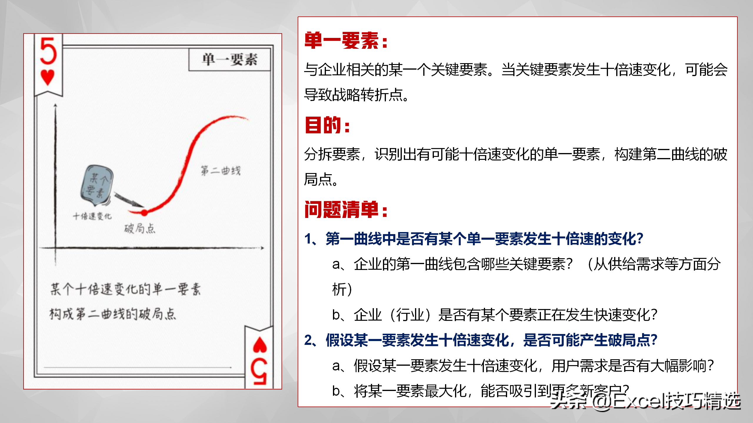 与企业相关的某一个关键要素。可以用来分拆要素,识别出有可能十倍速变化的单一要素,构建第二曲线的破局点;