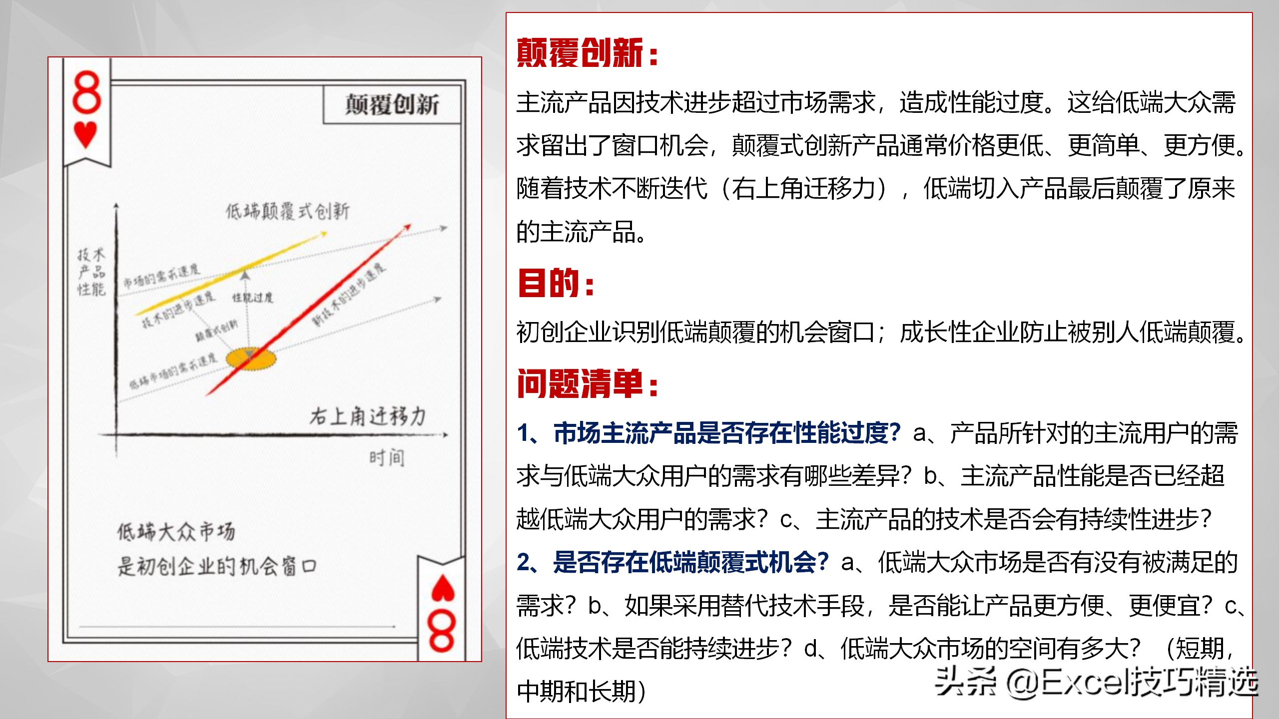 主流产品因技术进步超过市场需求,造成性能过度,这给低端大众需求留出了窗口机会。可以用来识别低端颠覆的机会窗口,或者,防止被别人低端颠覆;