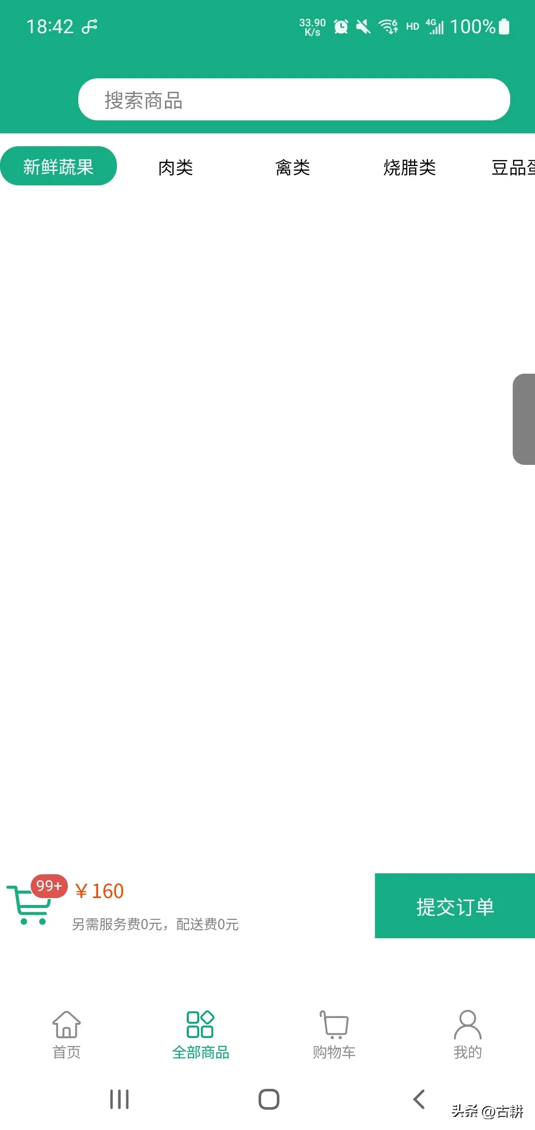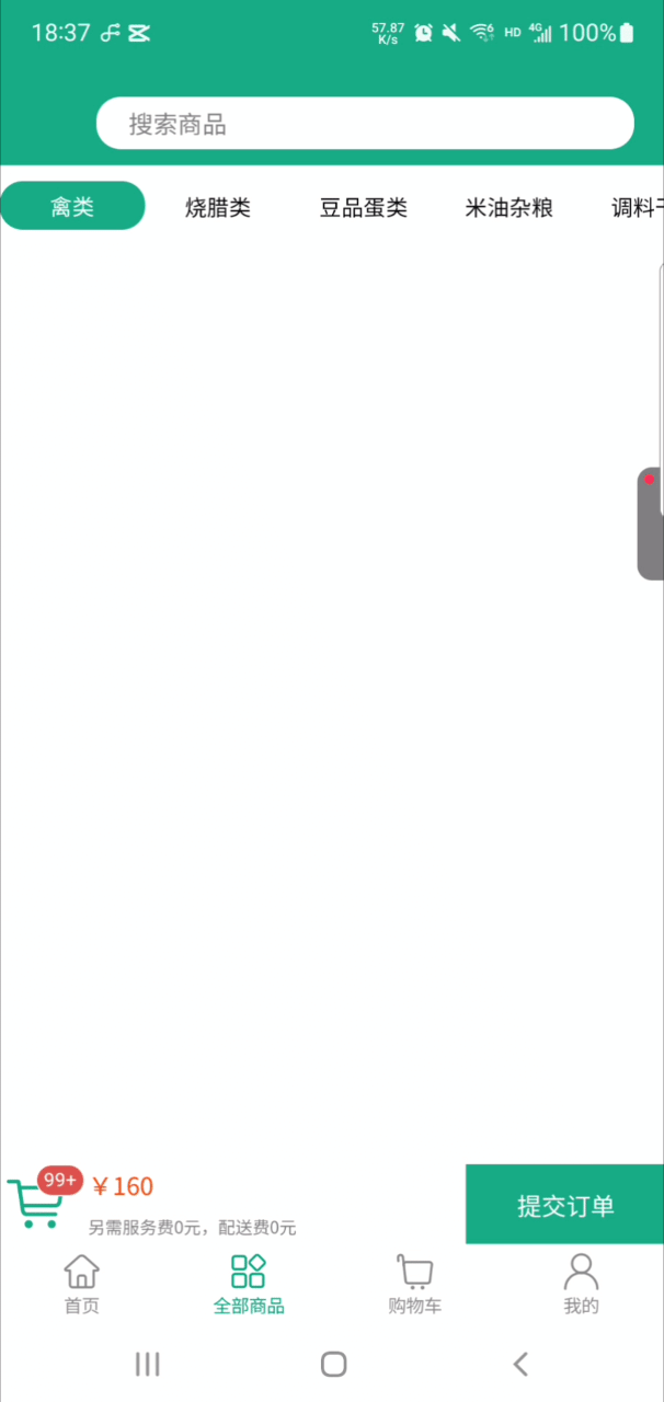 这个页面其实就是一个“商品列表”和“购物车”的页面。其中,商品的分类需要横向在一行显示,并且可以拖动。然后就是下方购物车,需要显示商品数量、金额、运费等等信息。最重要的是,点击下方购物车图标,会从底部弹出一个已经购买的商品列表信息。