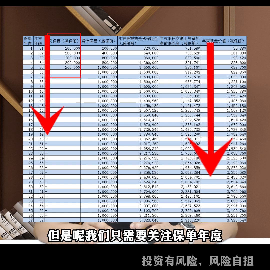 第一个,就是现金价值。简单理解就是退保能够退多少钱,比如说在产品第15年现金价值是30万,意味着这一年去退保的时候,可以拿到手的时候是30万。想要计算清楚收益,现金价值是非常重要的。