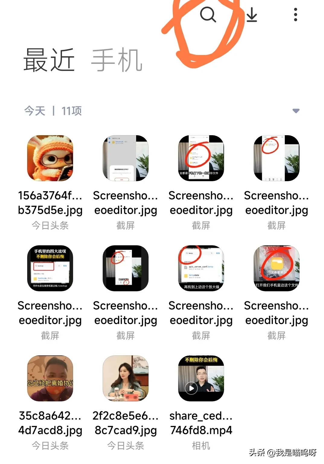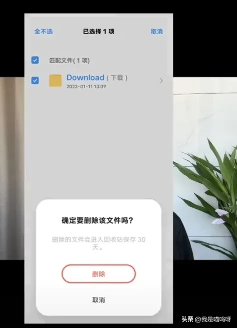 第四步,就是继续返回到搜索框里边, 输入download,它是下载的意思, 搜索之后出来的这些 ,全都是我们之前下载的一些目录文件 ,这些也会占用我们手机的大量内存空间 ,我们再长按一下, 然后点击全选, 把这个全部删除掉 。