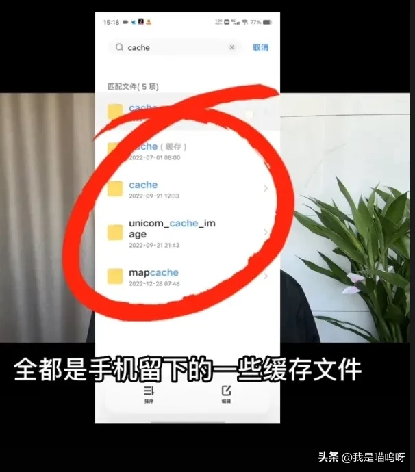 第三步, 还是返回到搜索目录里面 ,输入这个cache,这个单词是隐藏的意思, 之后我们点击后边的搜索, 然后出现的全都是手机留下的一些缓存文件 ,我们同样是长按一个下,然后把它们全部选中 ,再次点击删除。
