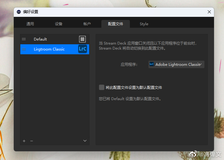 Elgato Stream Deck + 还支持特定应用位于前台时,自动切换特定配置文件,就是整个页面布局。我花了30分钟时间,摸清楚自己使用 Lightroom Classic 的使用习惯和方式,将对应的常用的快捷键设置好,现在打开软件自动切出这套配置,效率高多了。