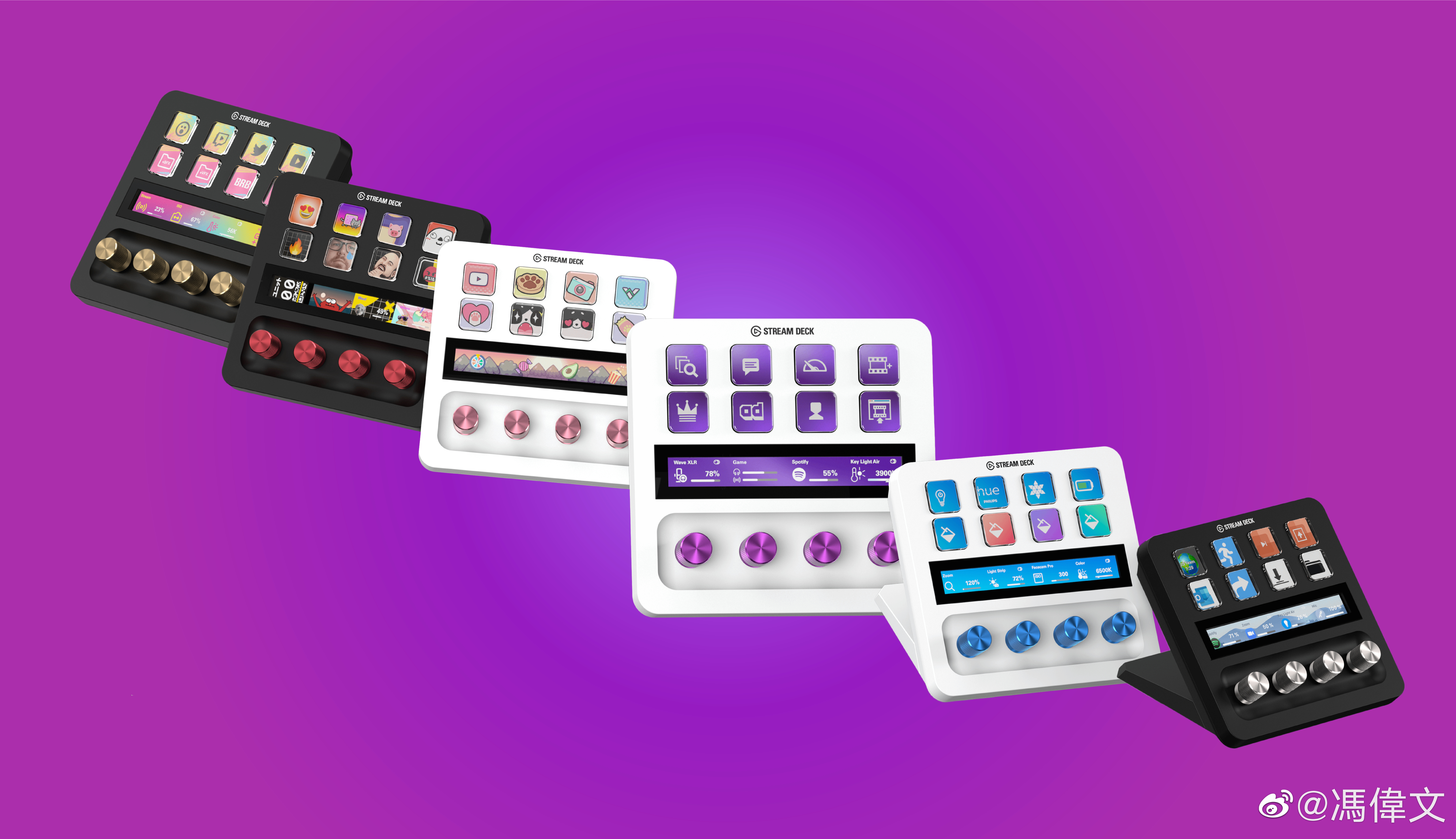 甚至....Elgato Stream Deck + 还有官方推出的不同颜色的旋钮以及可更换前面板设计。正因为如此丰富的定制化,每个人的 Elgato Stream Deck + 都不尽相同,更是可以为 LCD 按键、触控条背景选择自己喜欢的图案、图标,以及加上文字描述等,可以说是个性化程度最高的“客制化”。