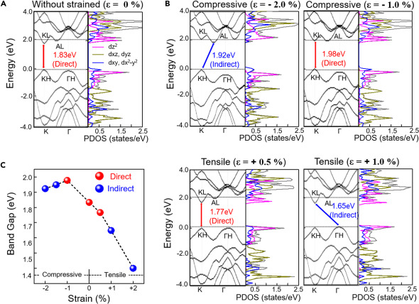 例如,据报道WS2的带隙单层因拉伸应变而减少,当拉伸应变达到2.6%,在我们的DFT计算中,带隙的减小及其从直接到间接带隙的转变,至于压缩应变,直接到间接带隙转变是在-1.5%的应变下观察到,带隙变化及其从直接到间接的转变可以通过中原子轨道之间耦合强度的应变诱导改变来解释。