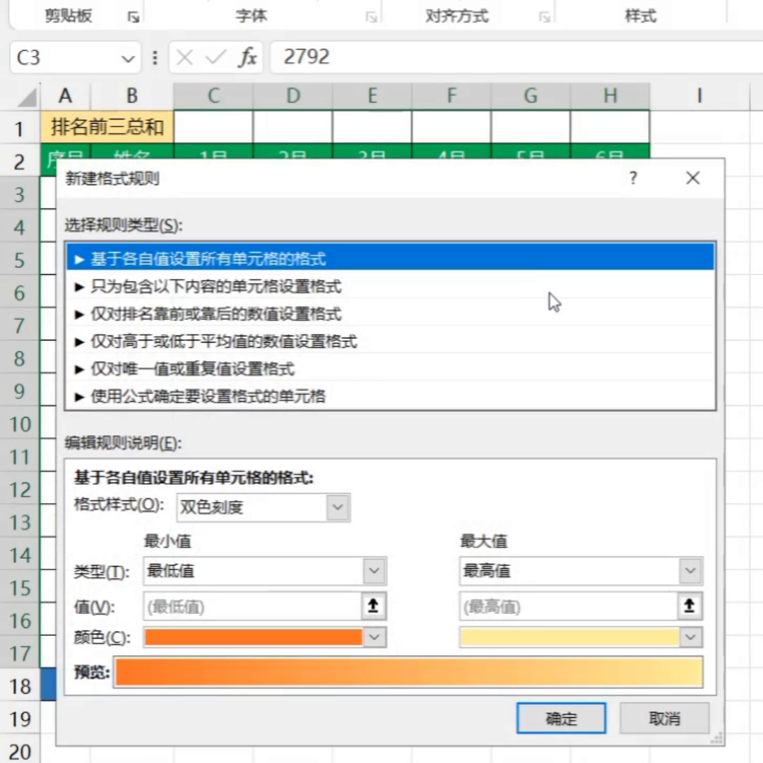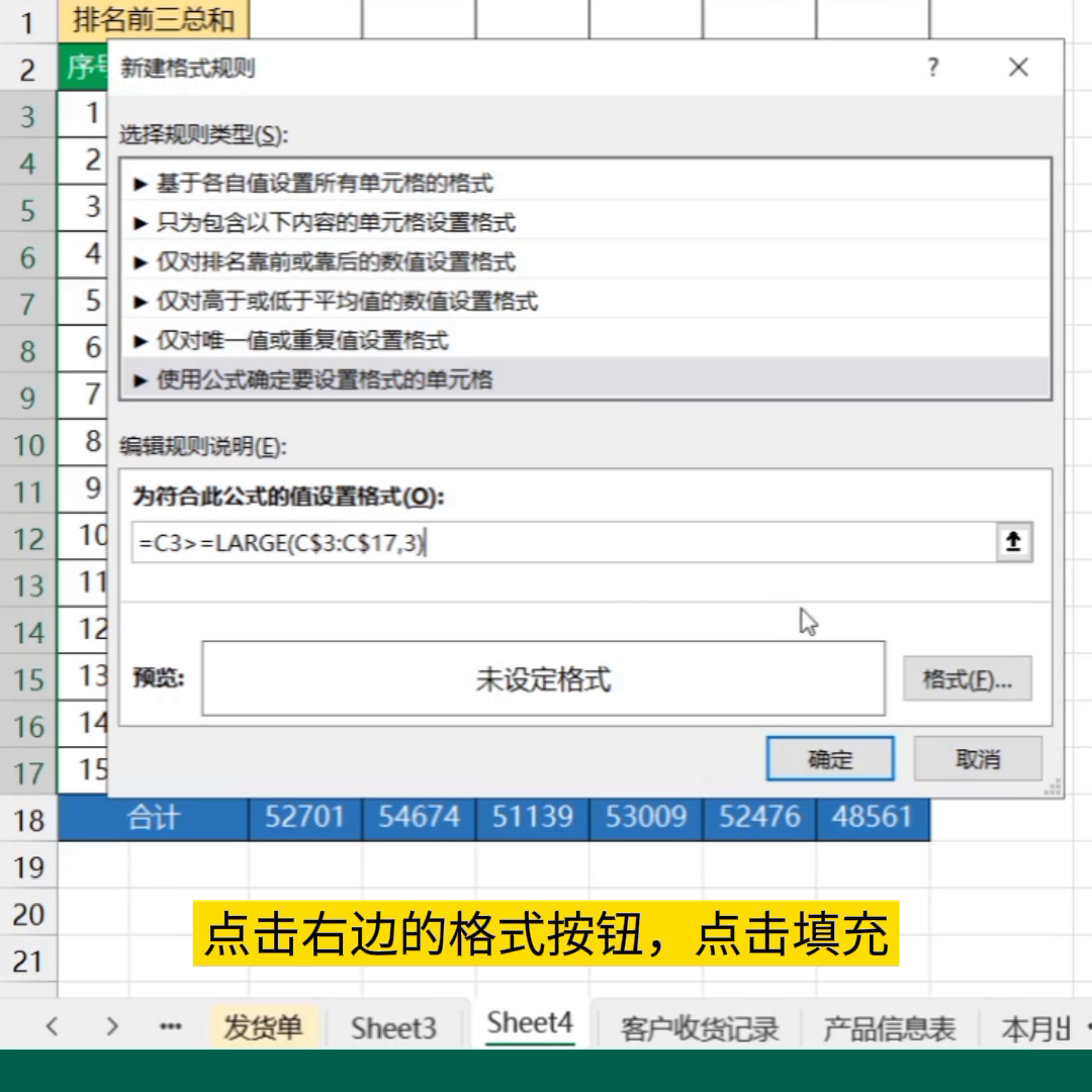 这个公式的意思是给数据排名前三的单元格设置格式,点击右边的格式按钮,点击填充,选择一种填充颜色,点击确定,再确定。这样每个月排名前三的数据就标记好颜色啦。