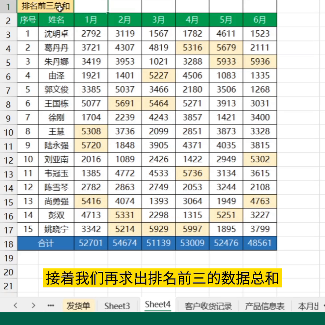 今天有个学员面试文员,考官让她们将表格中每月排名前三的数据标记出来并且计算出前三的数据总和,结果大部分女生做了半个小时才做完。其实使用条件格式和函数三十秒就可以批量搞定。