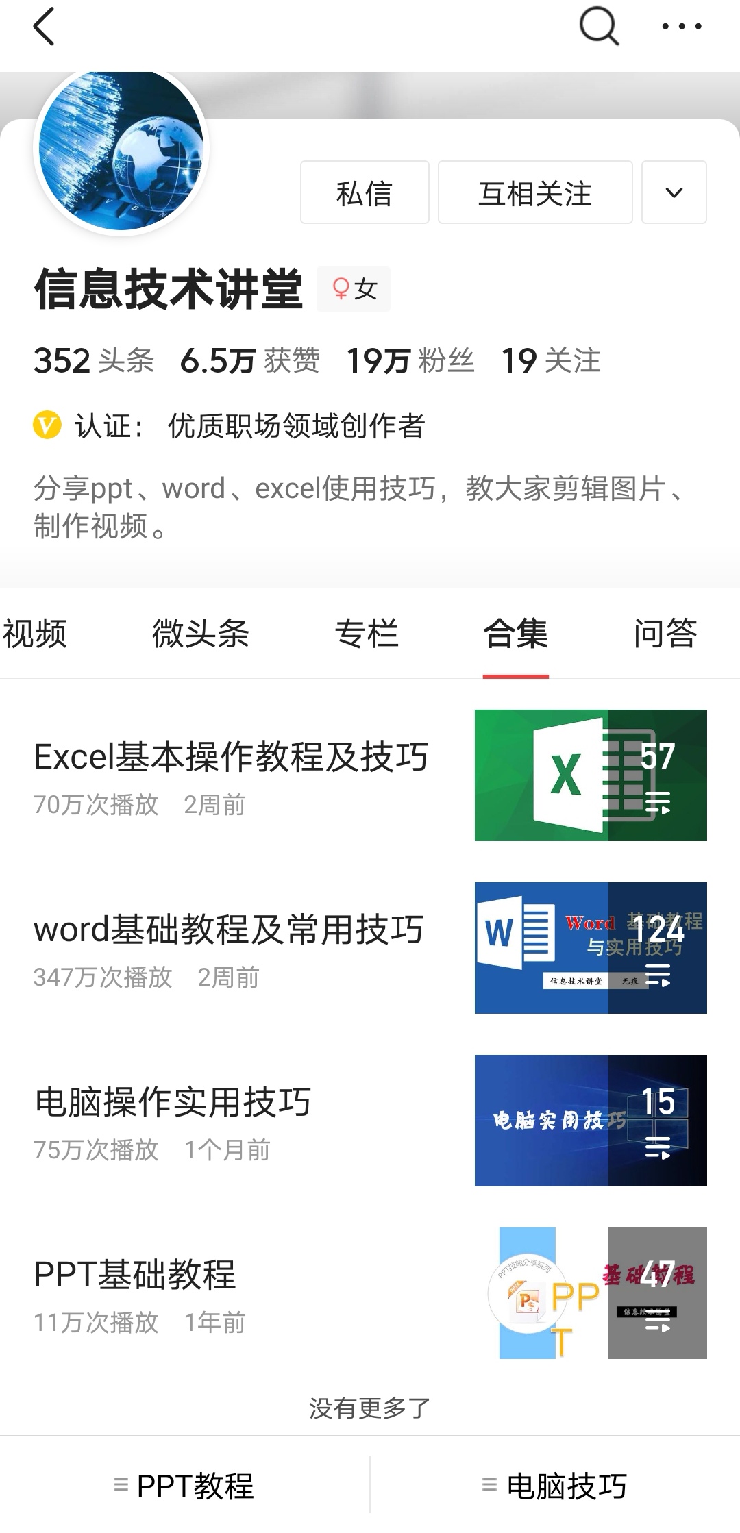 作为信息技术教师兼办公室主任的我,长期以来,结合自身工作实际,从实践者的角度为大家讲述了办公软件、视频软件的使用方法及技巧。到现在已经推出4个合集和2个专栏,想要系统学习办公软件,提升办公效率的同学、白领们可以在今日头条、西瓜视频、抖音上进入我的主页里面的“合集”“专栏”栏目下系统学习。
