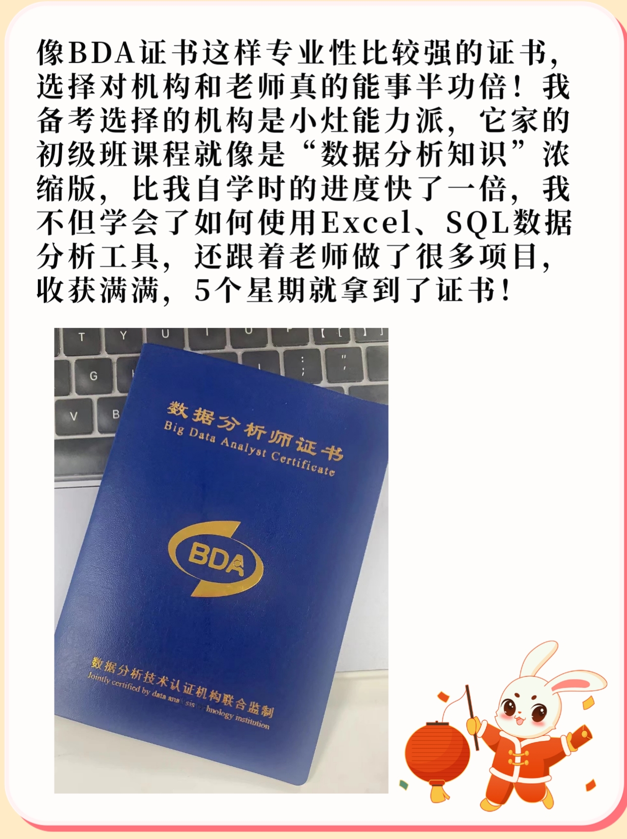 像BDA证书这样专业性比较强的证书,选择对机构和老师真的能事半功倍!我备考选择的机构是小灶能力派,它家的初级班课程就像是“数据分析知识”浓缩版,比我自学时的进度快了一倍,我不但学会了如何使用Excel、SQL数据分析工具,还跟着老师做了很多项目,收获满满,5个星期就拿到了证书!