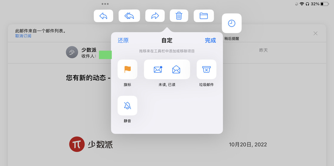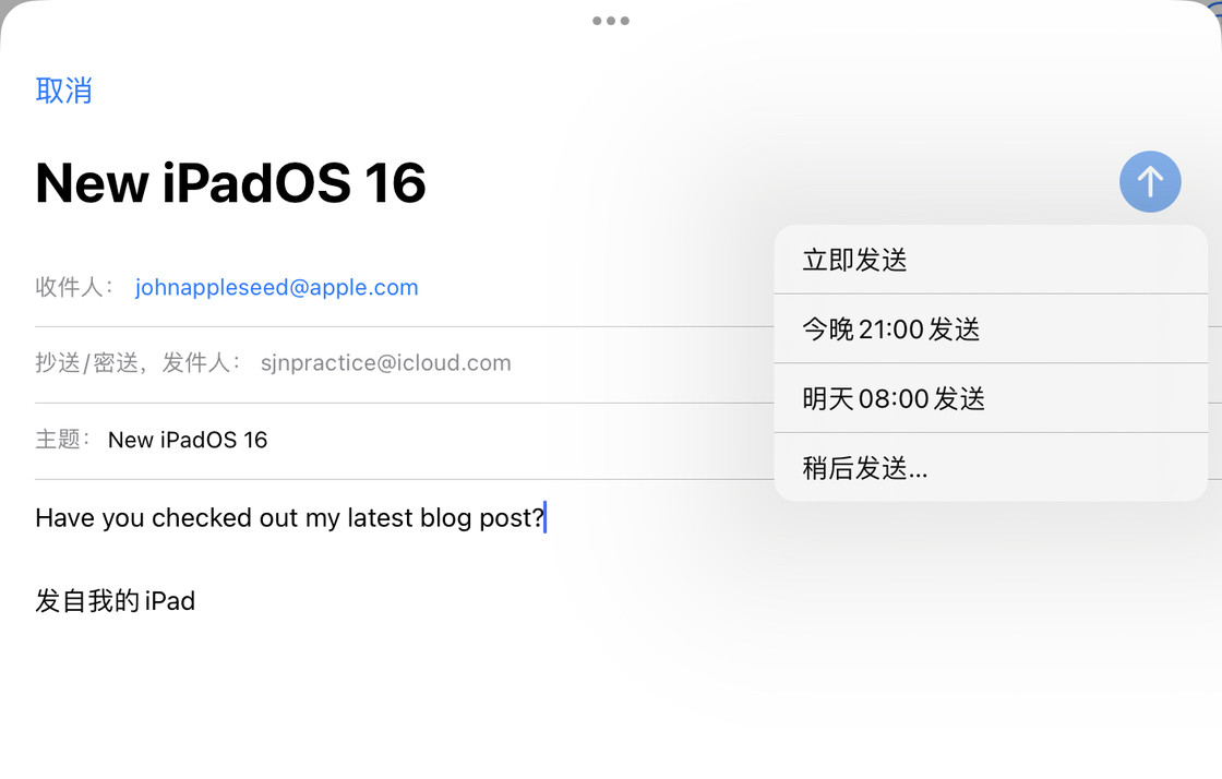 5-更加现代的「邮箱」应用:邮件应用也获得了不少实用的功能更新,例如邮件定时发送的功能。现在,在发送前长按发送按钮,就可以选择发送邮件的时间。系统提供了几个比较常用的时间作为默认的备选,当然也可以自己选择发送的日期和时间。