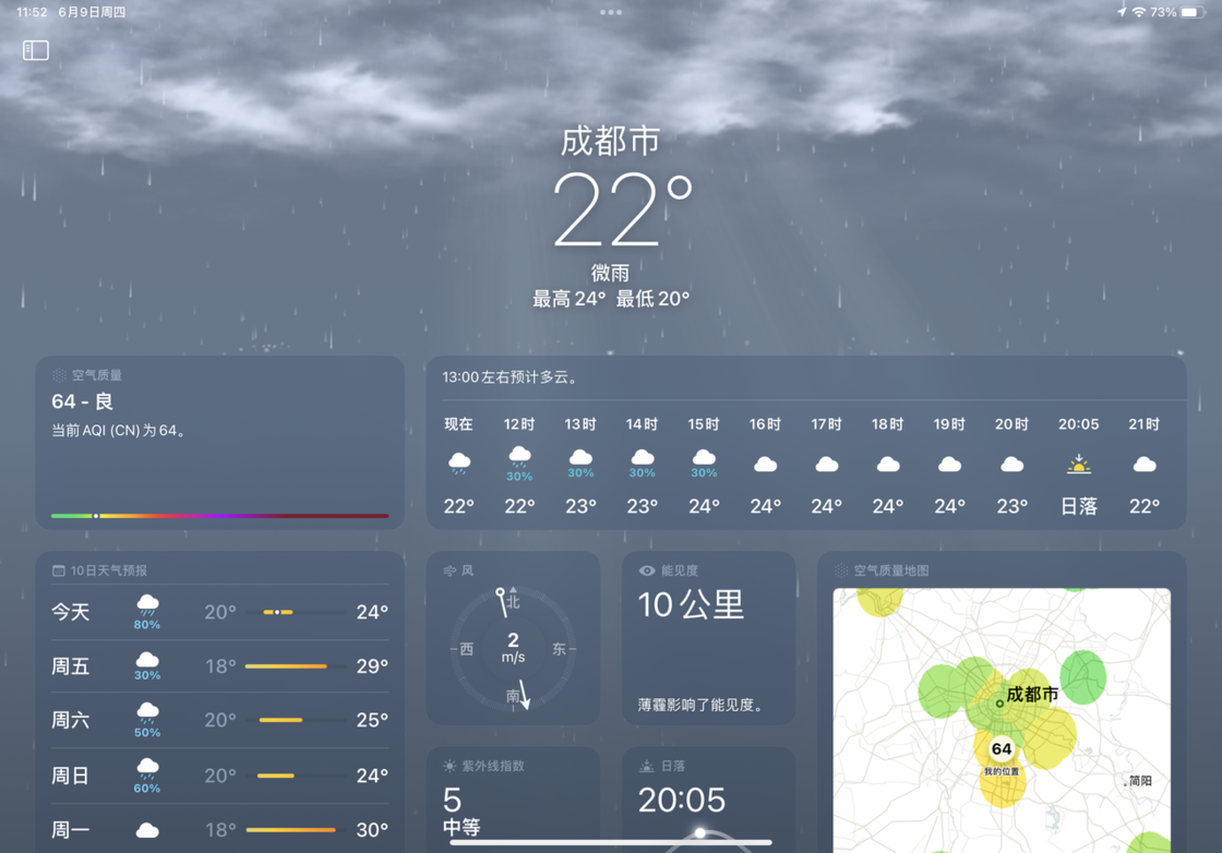 6-「天气」来到 iPad:现在在 iPad 上点击不同的气象模块可以显示美观的统计和趋势图,揭示相关天气指标的变化和趋势。同时,不同模块会根据可用性自动适应布局。
