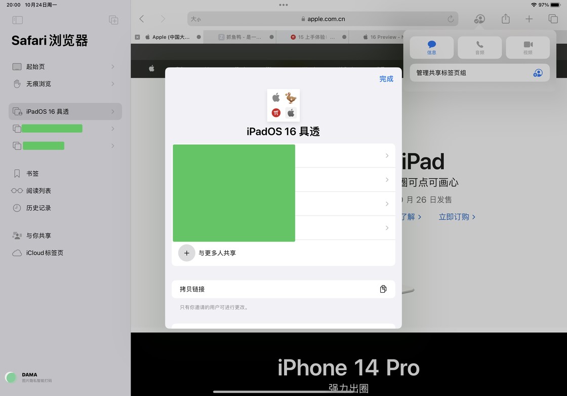 3-协作功能:支持了更多与协作有关的功能,在不同的 iPad 用户之间实时共享更多协作功能,例如 Safari 的「共享标签页组」功能、新的「无边记」app 等。