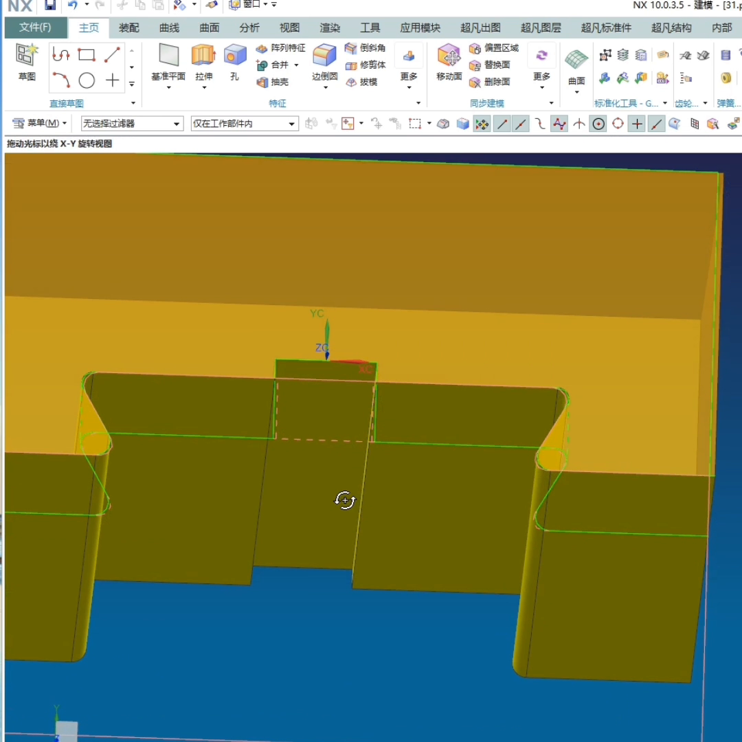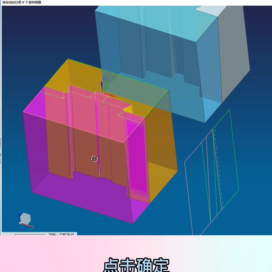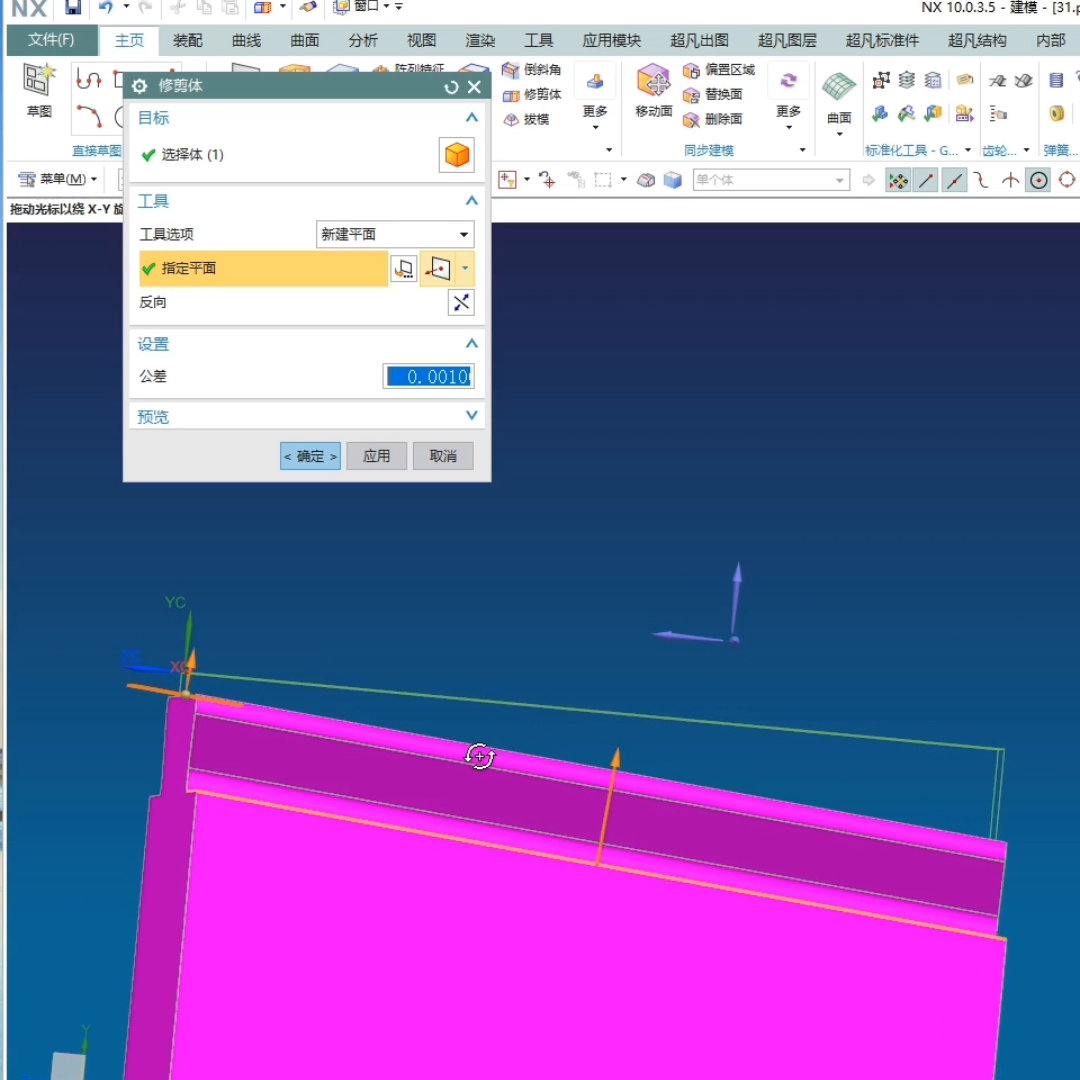 现在看一下它就是一个直的通面了,到时就是靠这个直面进行限位的,再把整个显示把这个单独打开。在这里我们看一下,同样的也要做一个直面,点击确定。把这两个进行求并,求并好了。然后把这个多余的进行修剪掉,点击修剪体选中它,选择这个点按照这个方向,调整一下,点击确定。