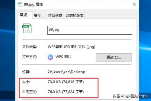 5、 我们重新右键图片属性,这时候,可以看到图片大小已经被压缩至70kb左右,如果你觉得还不够小的话,也可以进一步压缩。