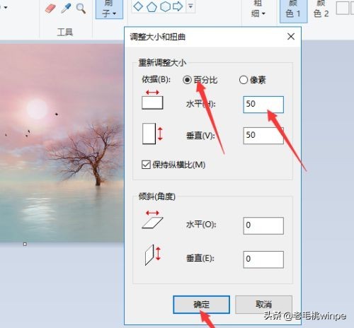 4、 在这里,我们可以调整图片的百分比和像素,比如说将百分比调节至50%,最后点击确定保存,即可压缩图片大小。