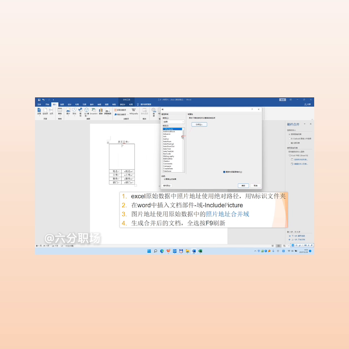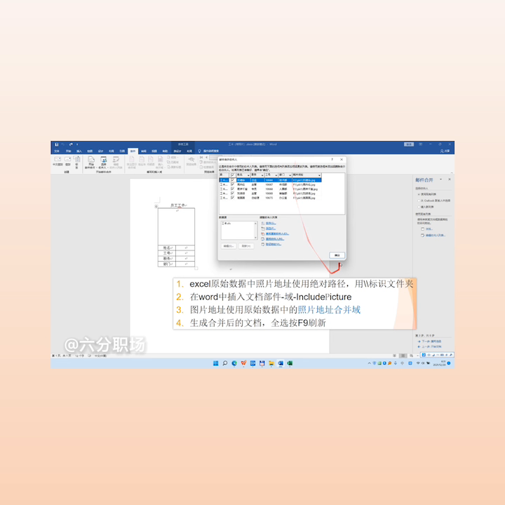 除了使用wps文字,也有一些同学说在word里面邮件合并照片和图片也遇到这个问题显示不出来或者只显示第一张,实际上他的操作也是用四步就能轻松搞定。如果这四步都严格的做好了,实际上百分之百的照片和图片都能完美显示,再也不用让妈妈担心为什么不行?来看一下在word的邮件合并要正确的显示批量的照片和图片,有四个步骤。