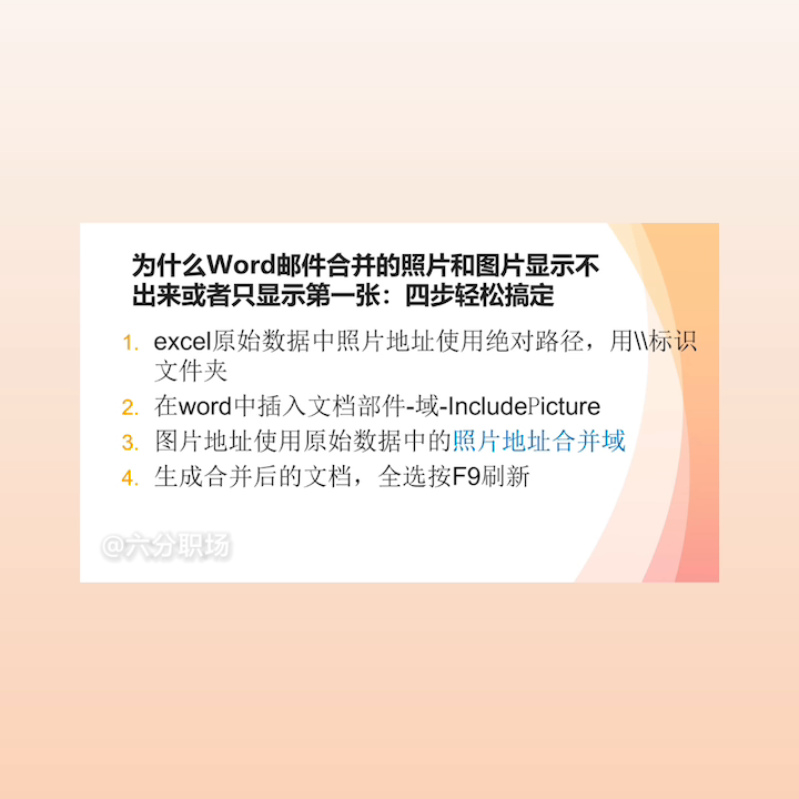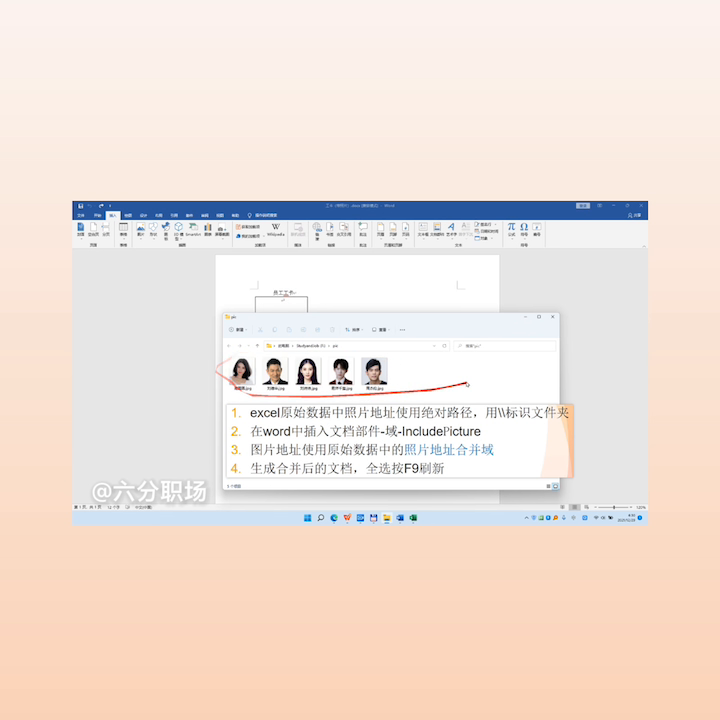 每一个人的公卡的照片和个人信息都完全对上了。整个邮件合并在word里面邮件合并显示照片和图片就搞定了,而且完美的实现。所以当在做的时候如果发现显示不出来,有可能是这四步当中的某一步没有按规范做好,没有按规范做好有可能用的不是绝对路径,有可能不是用这两个标识文件夹,有可能插入文档文档的时候没有插对,也有可能照片地址合并域没有按alt加alt九以后替换为照片地址的合并域。