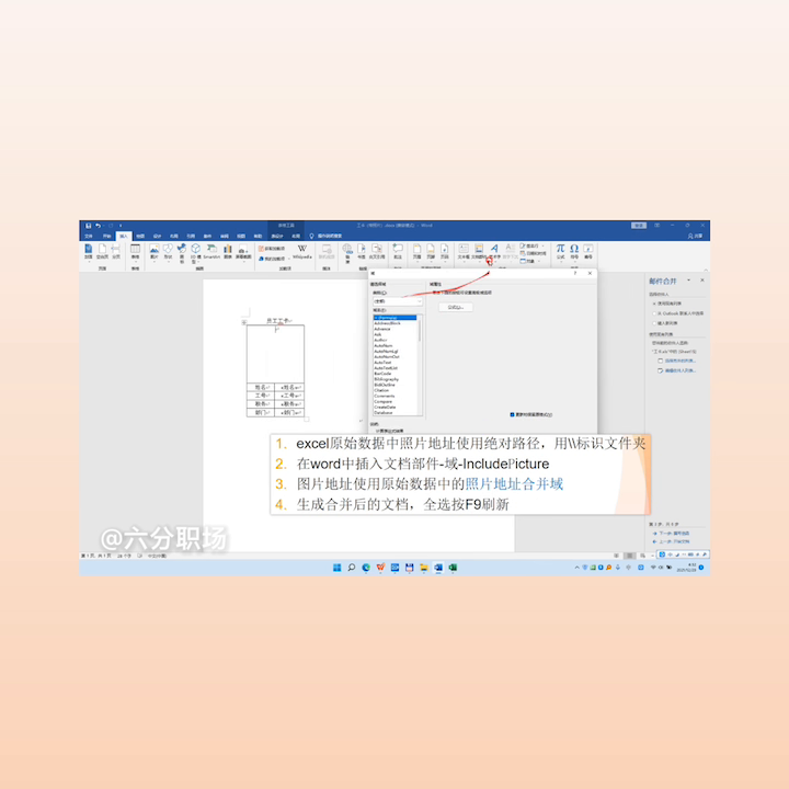 邮件合并的模板文件,最关键的一步很容易被忽略的。要注意在word中插入文档部件域,文档部件域就是在要插入照片或者图片的区域。点击插入,不在邮件合并里面,点击插入文档部件,在文本这里有个文档部件,选择与,往下拖动,选择word of picture,进入图片的意思。