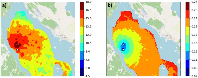 当所有观测值都用作 DFS 输入时,2009 年 6 月 16 日常规监测站的插值 Chl-a 为 15.3 µg/l。Chl-a 随着与两个站点周围区域距离的增加而降低,最低 Chl-a(约 10 µg/l)浓度出现在北部。相应地,SD 在两个站点附近最低(约 11%),在研究区的北部和东部最高(约 22%)。