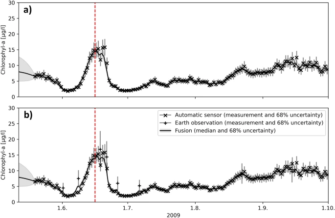 通过将 EO 观察结果添加到 DFS,我们在没有常规监测结果的时期内获得了更真实的 Chl-a 浓度。这种影响在 6 月底至 7 月初尤为明显,当时 EO 观测提供了有关 6 月中旬 Chl-a 峰值下降的信息。偶尔的 EO 观测也减少了不确定性,特别是当它们发生在无法获得常规水样的时期时。