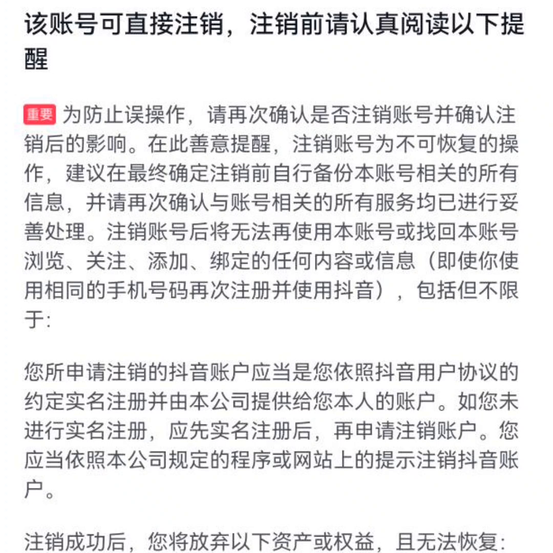 不出意外该账号可直接注销,注销前请认真阅读以下提重要为防止误操作,请再次确认是否注销账号并确认注销后的影响。在此善意提醒,注销账号为不可恢复的操作,建议在最终确定注销前自行备份本账号相关的所有信息,并请再次确认与账号相关的所有服务均已进行妥善处理。注销账号后将无法再使用本账号或找回本账号浏览、关注、添加、绑定的任何内容或信息(即使你使用相同的手机号码再次注册并使用抖音),包括但不限您所申请注销的抖音账户应当是您依照抖音用户协议的约定实名注册并由本公司提供给您本人的账户。如您未进行实名注册,应先实名注册后,再申请注销账户。您应当依照本公司规定的程序或网站上的提示注销抖音账号注销成功后,您将放弃以下资产或权益,且无法恢复: