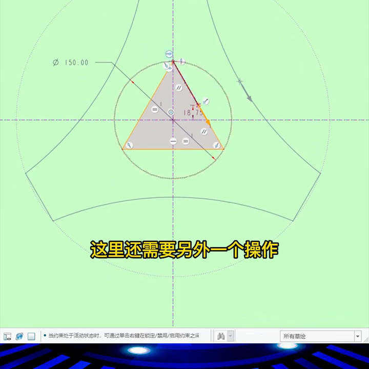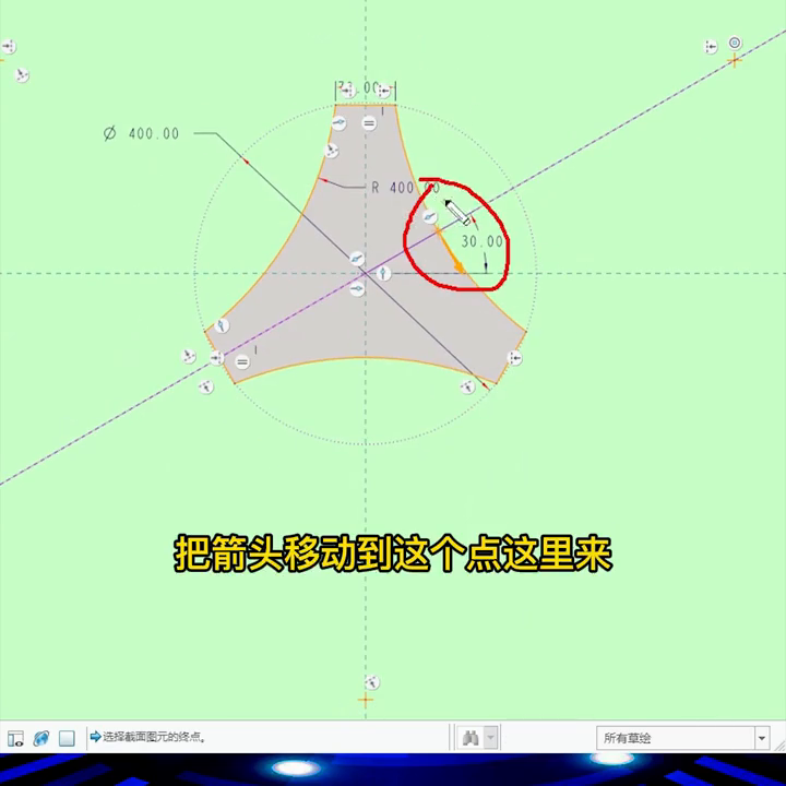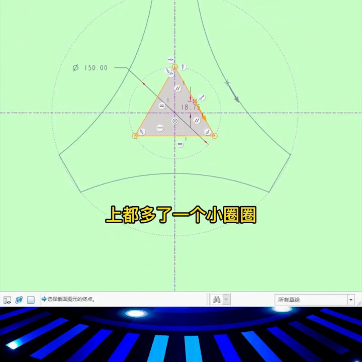 接下来做第二个混合截面,偏移高度输入60。然后草绘,绘制顶部的三角形轮廓,在这条边中间放个中点,同样是打断它,右键选择为起点。发现这两个箭头的方向不一样,再选择这个点,这样方向就切换为同一个方向了。