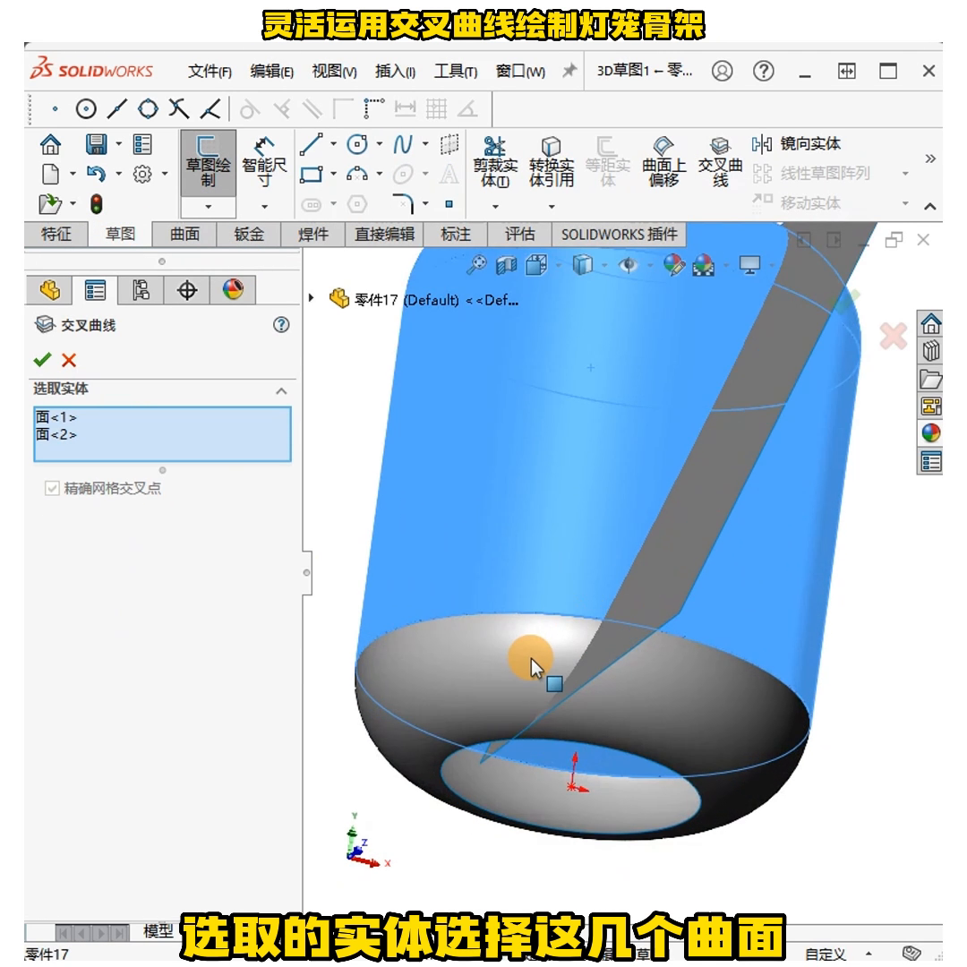 ·然后下一步选择进入3D草图当中,选择交叉曲线命令,选取的实体选择这几个曲面,点击确定,生成这样一根倾斜的线。此时退出3D草图,把这个拉伸的曲面暂时的隐藏掉。