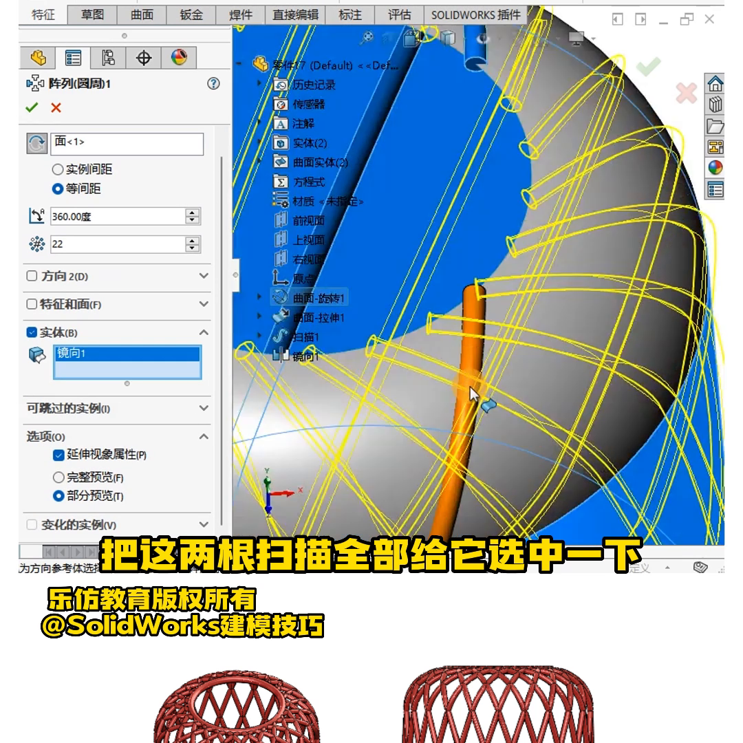 ·然后再下一步进行一次圆周阵列。圆周阵列的方向选择圆柱面,这个地方的阵列数量设置为22。然后再选取一下阵列实体,把这两根扫描全部给它选中,再点击确定,生成这样的效果。