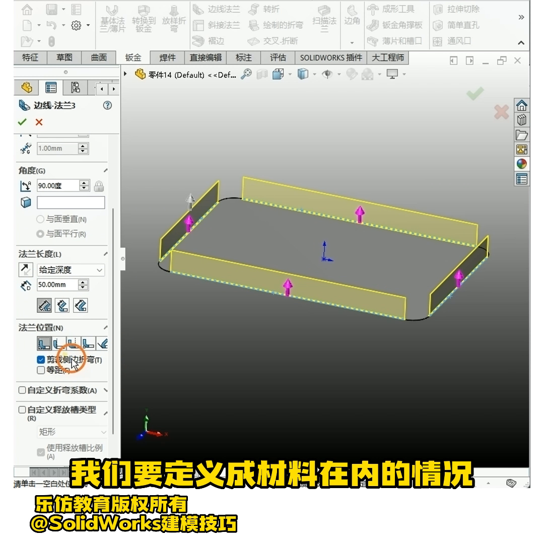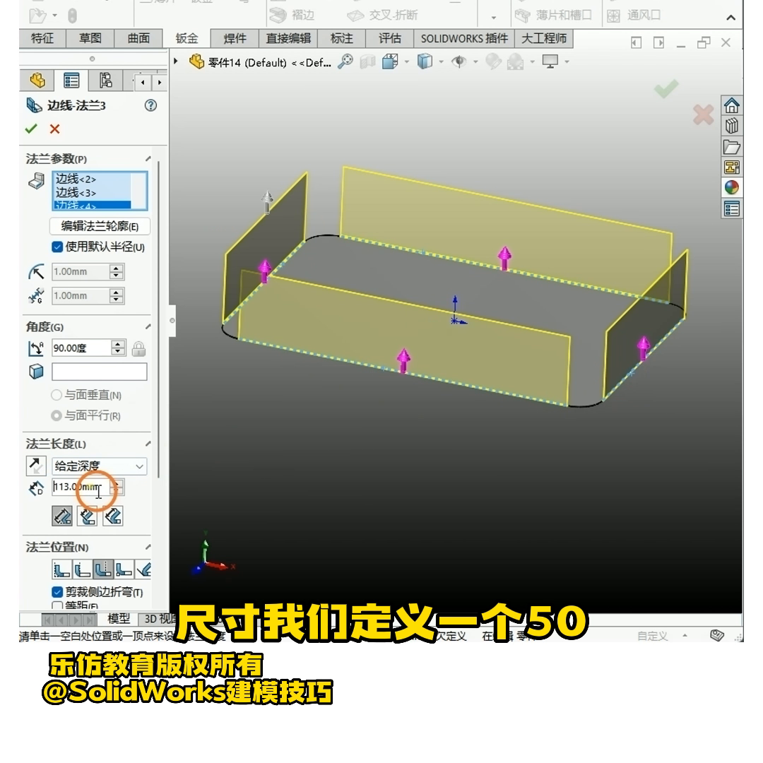 ·下一步我们来生成边线法兰。选择这四条边,尺寸我们定义一个50,注意在这里它的法兰位置要定义成材料在内的情况,然后点击确定。
