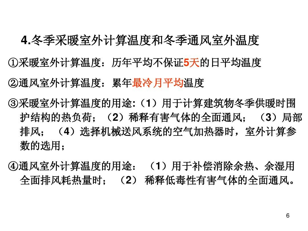 《规范》规定供暖室外计算温度取冬季历年平均不保证5天的日平均温度;冬季通风室外计算温度取累年最冷月平均温度。供暖室外计算温度用于建筑物供暖系统供暖时计算围护结构的热负荷,以及用于计算消除有害污染物通风的进风热负荷。冬季通风室外计算温度用于计算全面通风的进风热负荷。