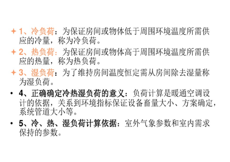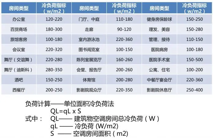 为了维持建筑物室内空气的热湿参数在某一范围内,在单位时间内需从室内除去的热量(包括显热和潜热)称为冷负荷,其中显热部分称显热冷负荷,潜热部分称潜热冷负荷,两者之和称全热冷负荷;相反,在单位时间需向室内供应的热量称为热负荷。从室内除去潜热,相当于从室内除去水分,把单位时间内从室内除去的水分称为湿负荷。