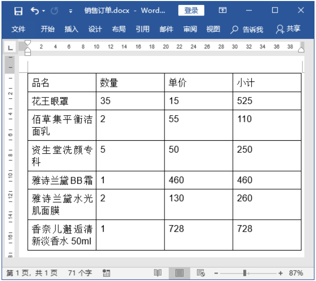 Step01 查看素材文件中的内容。打开“素材文件销售订单.docx”文件,可看见已经输入了以制表位为间隔的文本内容。