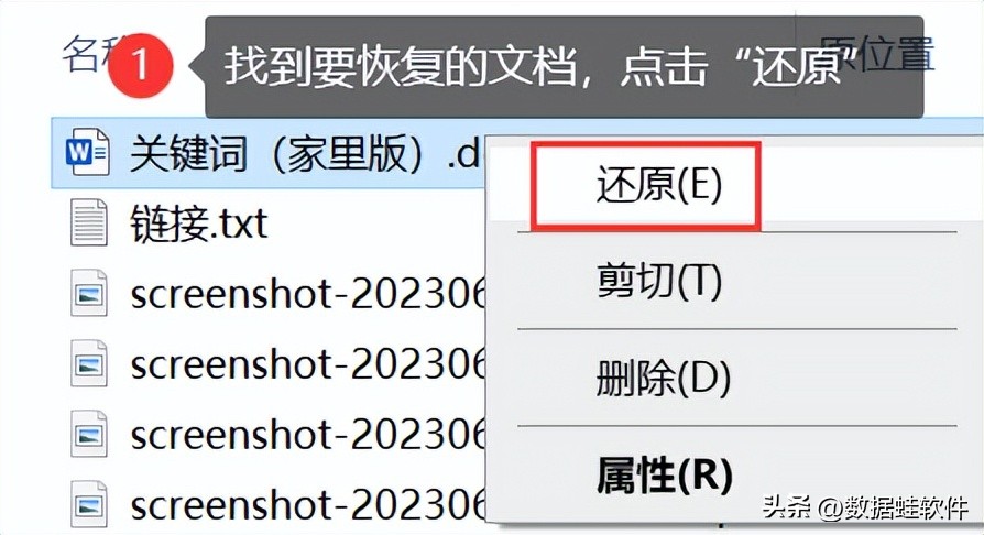 3.右键点击选中的文件,并选择【还原】,文件将被还原到原来的位置。
