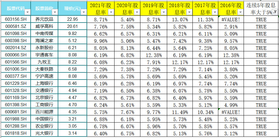 今天早上在i问财下载了2016、2017年的现金分红数据,加上之前下载的2018—2021年四年的数据,总共就有连续六年的每股现金分红数据了。套入公示简单地算了一下,截止5月13日,连续五年股息率大于5%的股票有17个,连续六年股息率大于5%的股票有11个。